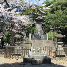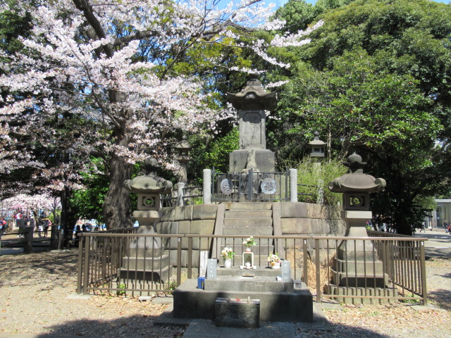 上野の山は幕末に、彰義隊の戦い(上野戦争)の戦場となっていましたが、根本中堂をはじめ、主要は焼失しました。上野戦争で戦死した彰義隊は徳川慶喜の警護部隊として政府に忠誠を示す部隊の墓所があります。木立の中に建っていて一対の灯籠に中央に石段が続き立派な墓石があって柵に囲まれていて背後には今満開の桜が見守っています。