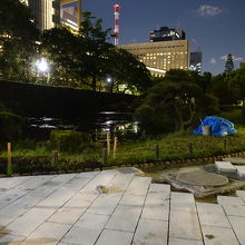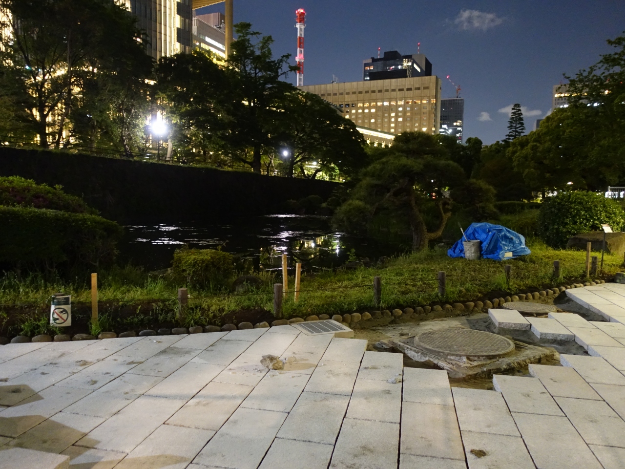 今回、初めて夜に通りかかりましたが、水面に日比谷エリアの高層ビルが反射してとても美しい光景が楽しめました。一方で、北側部分の池周辺は工事が行われており、ほとりまで近づくことが出来ないのが残念でした。