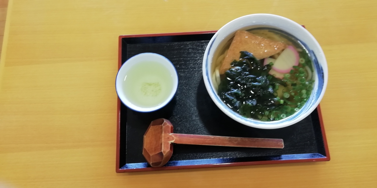 四国遍路3泊4日旅の三日目に23番薬王寺を参拝の後、昼食で利用しました。薬王寺に隣接して日帰り温泉施設「薬王寺温泉 醫王の湯」があります。薬王寺温泉は弘仁六年(815年)、弘法大師が42歳の厄年に薬王寺を開創した際、山腹より湧き出た霊水をみつけ諸病に卓効あることを試み病に苦しむ人々に温浴を教え薬水として服用をすすめ多数の人々を救ったと伝わる由緒ある温泉です。温泉施設内に無量寿という食事処があります。名物の厄除けうどん(税込730円)を食べました。油揚げ、かまぼこ、わかめの具の温かいうどんです。薬王寺でご祈祷済のお餅が入っているのが特徴です。大変美味しく薄味の出汁まで完食しました。昼食処が見つからない時に備えて当日朝コンビニで買った梅おにぎりも食べ満腹になりました。最寄り駅の日和佐には11:01に着き次のJRは13:02でしたので薬王寺では2時間近い時間がありましたが薬王寺を40分程かけて参拝し、無量寿で45分程ゆっくりと食事と休憩ができました。無量寿とは薬師如来の功徳(妙薬)によって無限の生命を伝えていくという意味です。