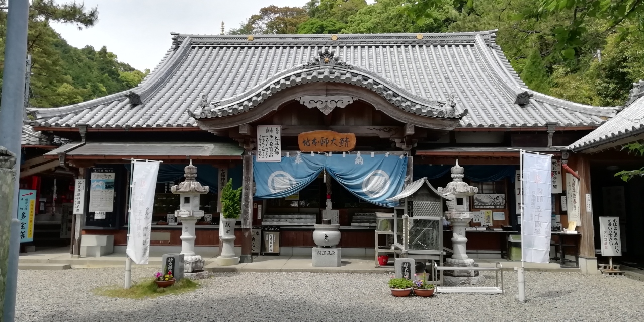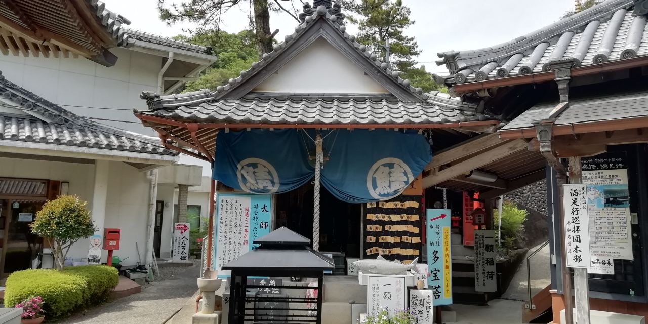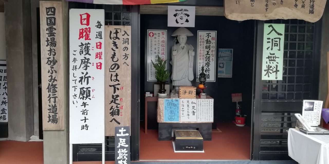 四国遍路3泊4日旅の三日目は22番平等寺と23番薬王寺を参拝の後、鯖大師に立ち寄りました。番外札所で別格二十霊場の4番札所に当たります。JR鯖瀬駅から徒歩2、3分、馬頭観音を祀る護摩堂(八角堂)を右手に見て「四国霊場番外札所鯖大師本坊」の石柱を先に進むとこぢんまりとした境内の正面に立派な本堂が建っています。本堂の左には小ぶりな大師堂があります。「千二百年程前、弘法大師が四国をお開きに巡られた折、この地が霊地であることを悟り修行された。 ある朝通り掛かった馬子に積み荷の塩鯖を乞われたが、口汚くののしられ断られた。馬子が馬引坂まできた時、 馬が急に苦しみだし、先ほどの坊様がお大師様と気づいた馬子は鯖を持っておわびし、馬の病気をなおしてくれるように頼んだ。お大師様がお加持水を与えると馬はたちまち元気になり、お大師様が八坂八浜の法生島で塩鯖をお加持すると生きかえって泳いでいった。そこで仏の心を起こした馬子は、この地に庵をたて古今来世まで人々の救いの霊場とした。鯖を三年絶ってご祈念すると願いごとがかない病気がなおり幸福になれるといつしか人々に、鯖大師と呼ばれるようになった。」と伝わるお寺の本堂と大師堂を興味深く参拝しました。本堂右手に「四国霊場お砂ふみ道場」「入洞無料」という建物があり靴を脱いで入りました。薫煙たなびくお釈迦様の仏足石で足裏を清めた後、洞内に入り度肝を抜かれました。全長88メートルの大洞窟(不動洞)の左側に四国八十八ヶ所と別格二十霊場のご本尊が並び足元の各霊場のお砂を納めた蓮華台を踏みながら進みます。右側には全国の都・道・府・県別に万体の不動尊像が祀られています。暗い洞内にLEDで照らし出されたお像が浮かびあがる様は神秘的です。洞の突き当りは護摩堂の内陣になっています。全国の信者御祈願大不動明王像がLED照明され荘厳で忘れ難い雰囲気です。本堂に上がると西国三十三観音霊場のお砂踏ができます。本堂と大師堂の間には一願稲荷があります。お願い事を一つお頼みして願いを成就するお稲荷です。健康長寿を祈願しました。その先の高みには多宝塔があります。平成22年(2010年)落慶の新しい塔です。般若心経のお写経を奉納する塔です。美しい塔です。最寄り駅であるJR鯖瀬駅着が13:27で次のJRが15:28だった為、時間を持てますかと思いましたが、隠れた見所が多くゆっくりと1時間以上かけて大変充実した参拝となりました。お寺を出る際、再び護摩堂前を通りましたが四国霊場の洞窟(不動洞)が護摩堂まで貫かれているとは驚きです。不動洞の参拝は絶対のお薦めです。