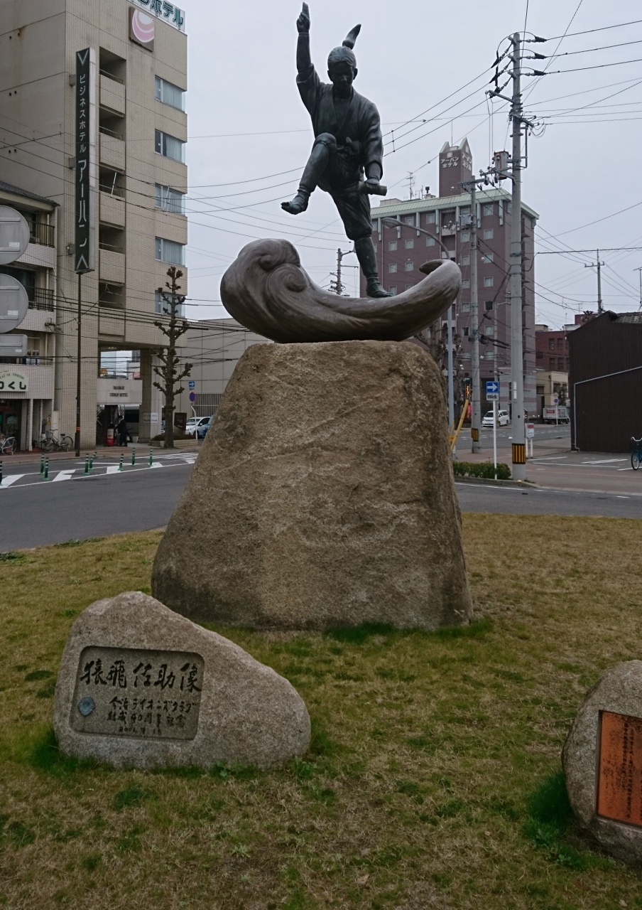 今治駅前のバス停の横にありました。架空の人物である猿飛佐助の銅像があるのか不思議でしたが、真田十勇士の猿飛佐助の原作者一族の出身地とのことでした。