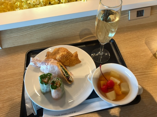 JALのラウンジになります。食事のバリエーションは、日系は弱いと思います。外資系の航空会社はかなり力を入れているので。食事をするというよりは、軽食を取るといった感じの方が近いと思います。なぜかサクララウンジは騒々しい感じが強くて、私はあまり好きではありませんでした。もう少しラウンジに力をいれてくれるといいのですが。