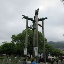 長崎の平和公園の平和の泉を過ぎて右手に、立派な青銅製の鐘が建っていました。多くの花が供えてあり、支柱には原爆の絵とその説明文がはられていて、ビジュアルに訴えることで多くの人に長崎で起きた出来事を伝えられるよう工夫されていました。