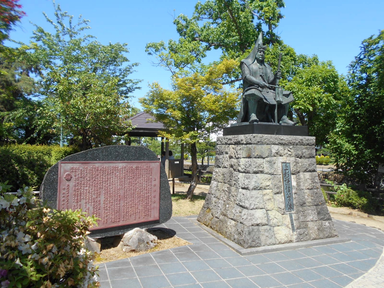 米沢市といえば、会津120万石から米沢30万石に移封された上杉氏の城下町で、その中心の元のお城、現在の上杉神社に、米沢には直接の関係はない謙信公の像と説明文があります。