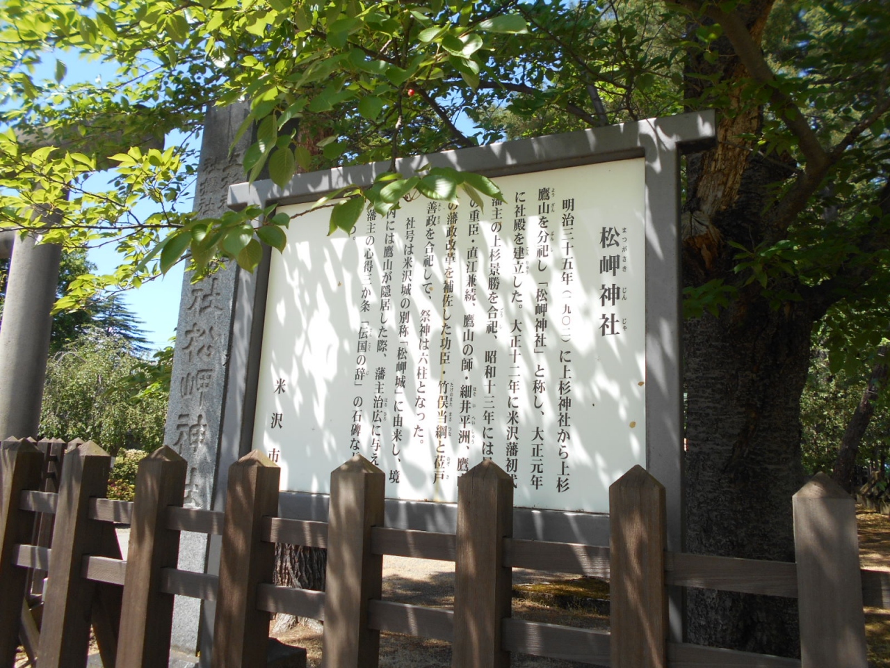 上杉鷹山は明治の神仏分離によって、上杉謙信の祠堂を改めた上杉神社に合祀されたというが、明治35年に上杉神社が別格官幣社に列せられるに際し、米沢城二の丸世子御殿跡に設けた摂社「松岬神社」へ遷されることになったとされる。