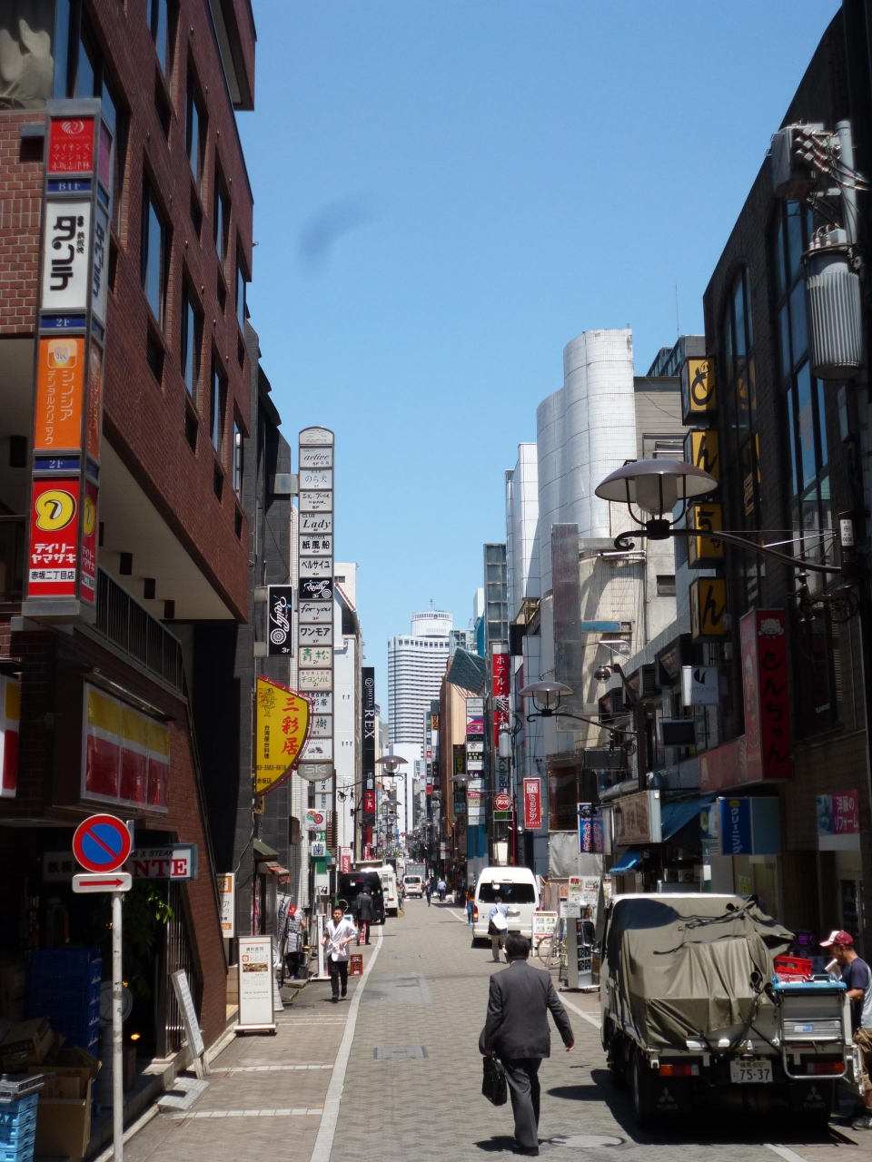 「赤坂みすじ通り」は、通りのはるか向こうにはホテルニューオータニの新館タワーが見えます。昼と夜では様相が異なりますが、赤坂通りよりも南側は、さほど派手さはありません。しかしながら、人気の韓国料理店が点在しており、近隣にお勤めと思しき人の姿が多数見られました。
