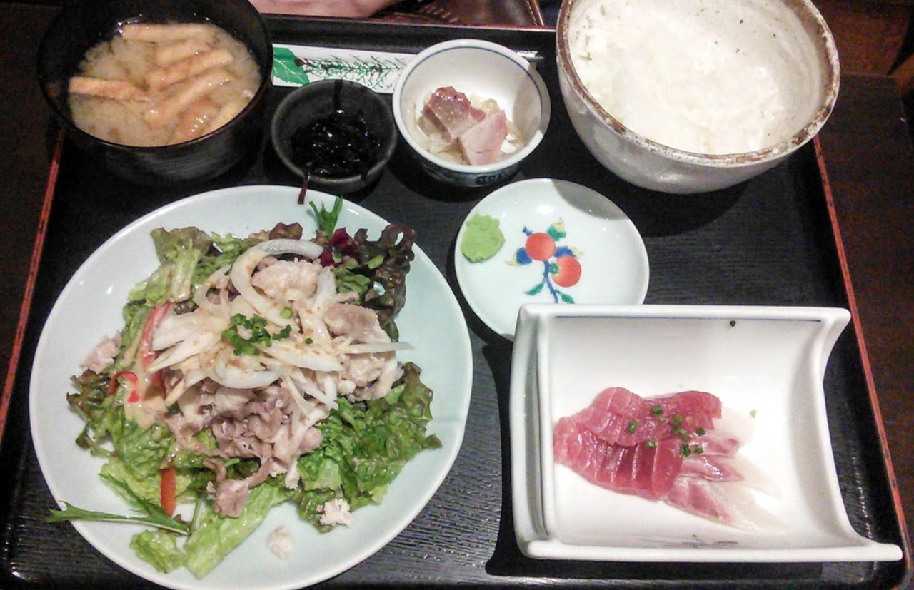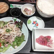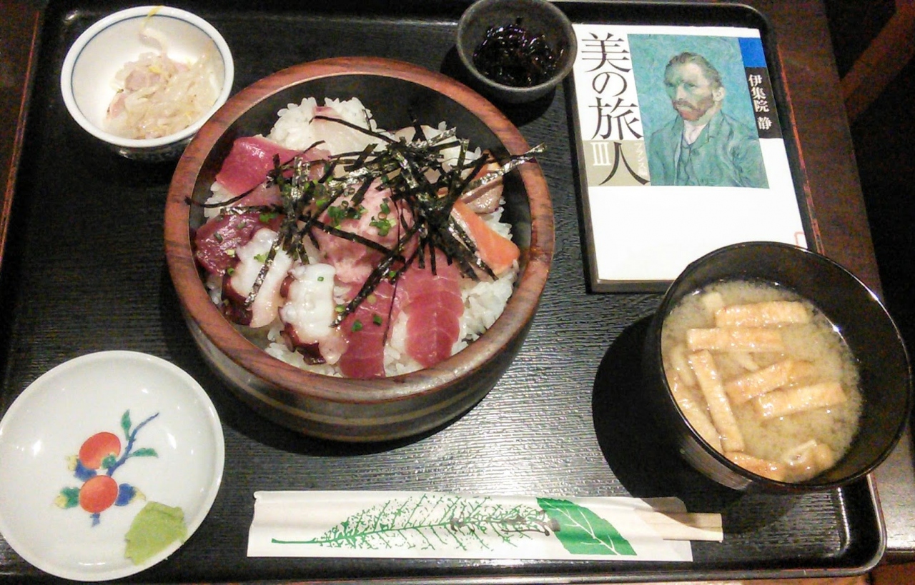 鮮度にこだわったシーフードを盛り合わせた海鮮丼やお刺身定食がお手頃価格でいただけるお店です。海鮮丼の中身は、ねぎとろ、まぐろ、天然ヒラメ、カツオ、ずわいがに、モンゴイカ、マダコ、水タコ、ホタテ、甘エビ、コチ、サーモンづけ炙りから、お好みのものを6種類選べます。刺身定食も好みの刺身を2種+焼き魚や肉料理などのバラエティ豊かなメニューから一つ選ぶシステムで、魚が苦手なら肉のおかずを2種選んでいただくことができます。天然ヒラメとまぐろのお刺身、豚しゃぶサラダをいただきました。近隣で働く会社員に人気のお店のようで、焼き魚など既に売り切れてしまったおかずも少なくなかったです。魚好きの方は、早めの時間帯に訪れた方がいいかもしれません。
