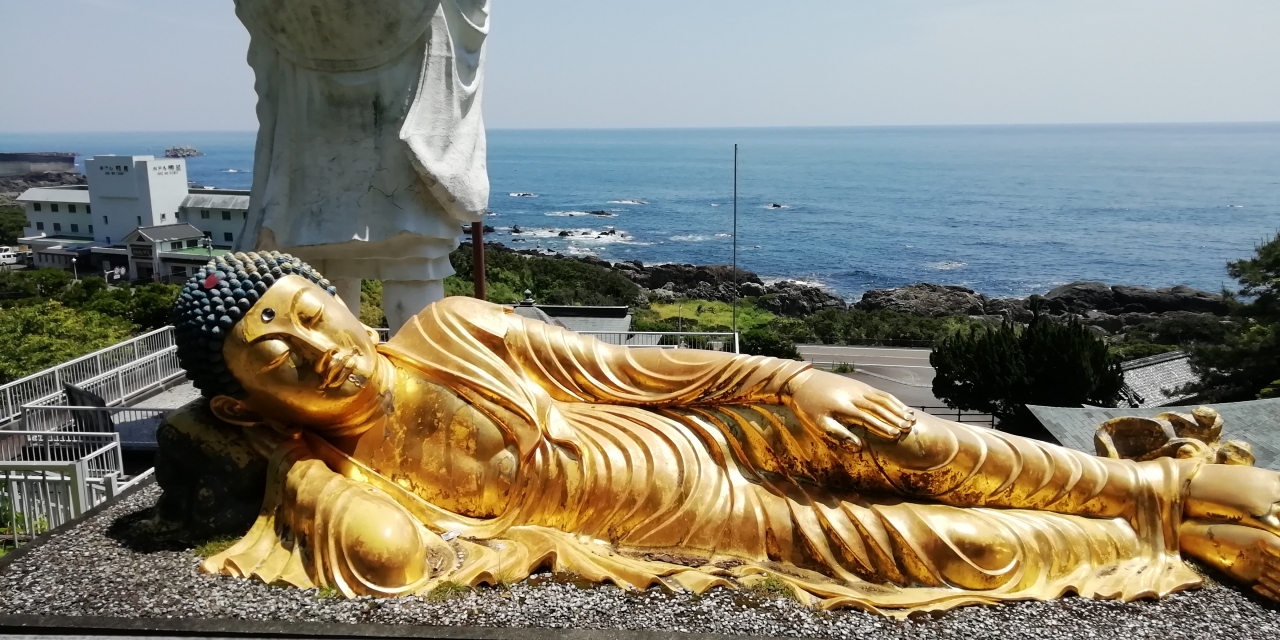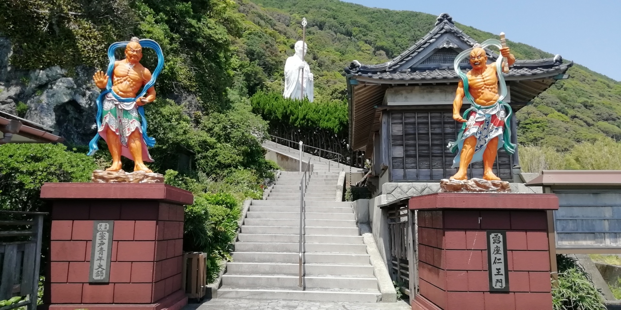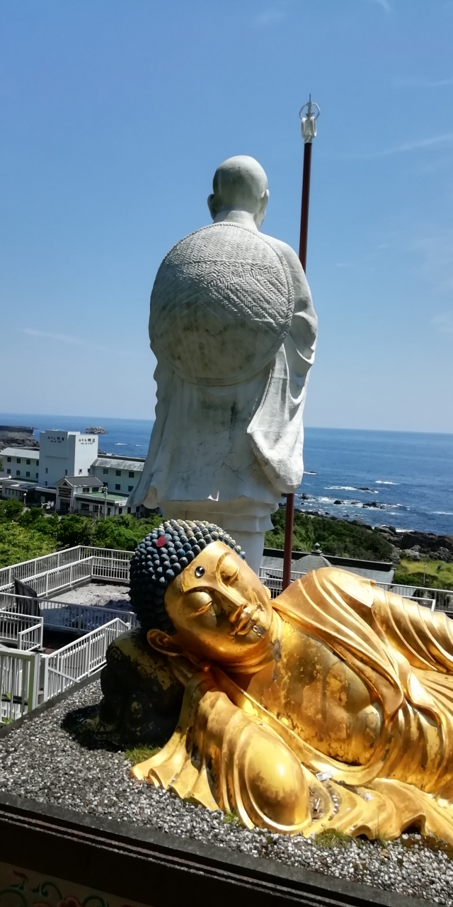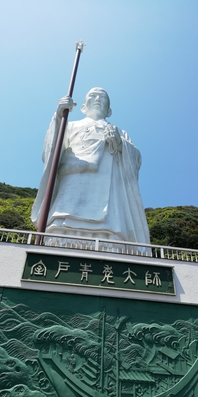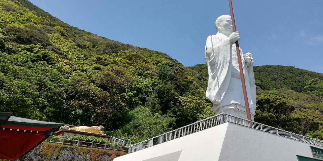 四国遍路3泊4日旅の最終日は室戸岬に向かいます。宿泊先のHotel Rivieraの最寄り駅である宍喰から鉄道で甲浦へ出て甲浦9:59分発の高知東部交通バスに乗りました。バスは太平洋の海外線沿いの国道55号線を走りますが徳島県では余りお目にかからなかった歩き遍路の方が車窓からぽつぽつと見受けられます。徳島県では遍路道は車道ではなく山道などが多くありましたが徳島県の23番薬王寺から高知県の24番最御崎寺まではバスの通る国道55号が遍路道となっているためと思われます。快晴の青空と太平洋の大海原や途中巨岩の夫婦岩などを左に見ながらバスに乗ること1時間程、大師像前でバスを降りました。海に面する新緑の山腹に白亜の大きな像が立っています。青年大師像です。若き日の弘法大師(空海)は室戸岬を修行地として選び、難行苦行の末多くの悟りを開いたと言われています。像は昭和59年(1984年)大師の徳を慕う信者や一般の方々の寄進によって建立されたものです。大変大きな像で台座の5mを含み像全体の高さは21mあります。青年空海の凛々しい修行姿が印象的です。像は明星来影寺というお寺にあり像を間近で見ようと思うと300円の拝観料が必要です。境内では大師像を間近に拝めます。白亜の大師像が新緑と青空に映えます。大師像の後方の高みに大きな黄金の涅槃像があります。涅槃像は大師に背を向けて寝そべっています。高みに上り黄金の涅槃像を正面に快晴の青空の下に立つ白亜の大師像と雄大な太平洋を眺めました。美しい眺めでした。