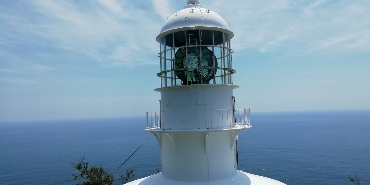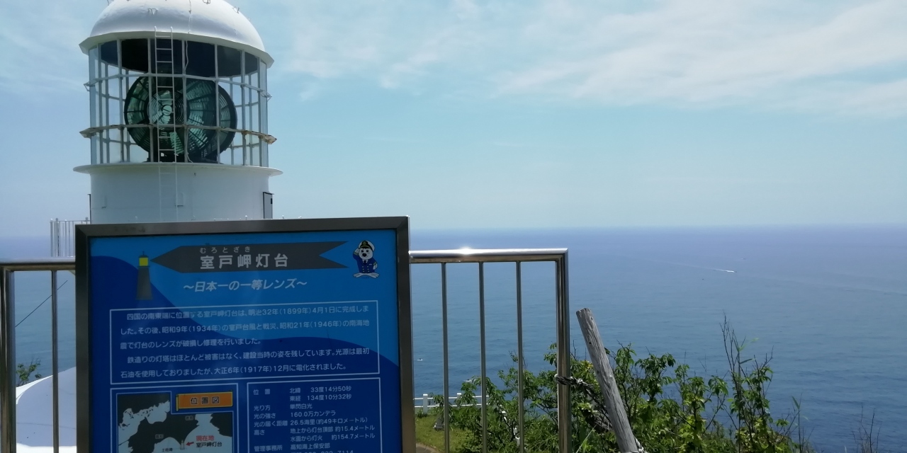 四国遍路3泊4日旅の最終日、24番札所の最御崎寺の参拝を終え仁王門をでて道標に従い室戸岬灯台に向かいます。緩やかな坂道を下ることほんの数分のところに灯台があります。岬の突端の灯台をイメージしていましたが最御崎寺のある山の中腹標高151mにあります。雄大な太平洋の水平線と青空を背景に白亜の灯台が映えます。「青い空と海のはざまに立つ白亜の灯台」という謳い文句通りの美しさです。明治32年以来、航海者たちの安全を照らす水先案内人として活躍しておりレンズの大きさは直径2m60cmと日本最大級です。