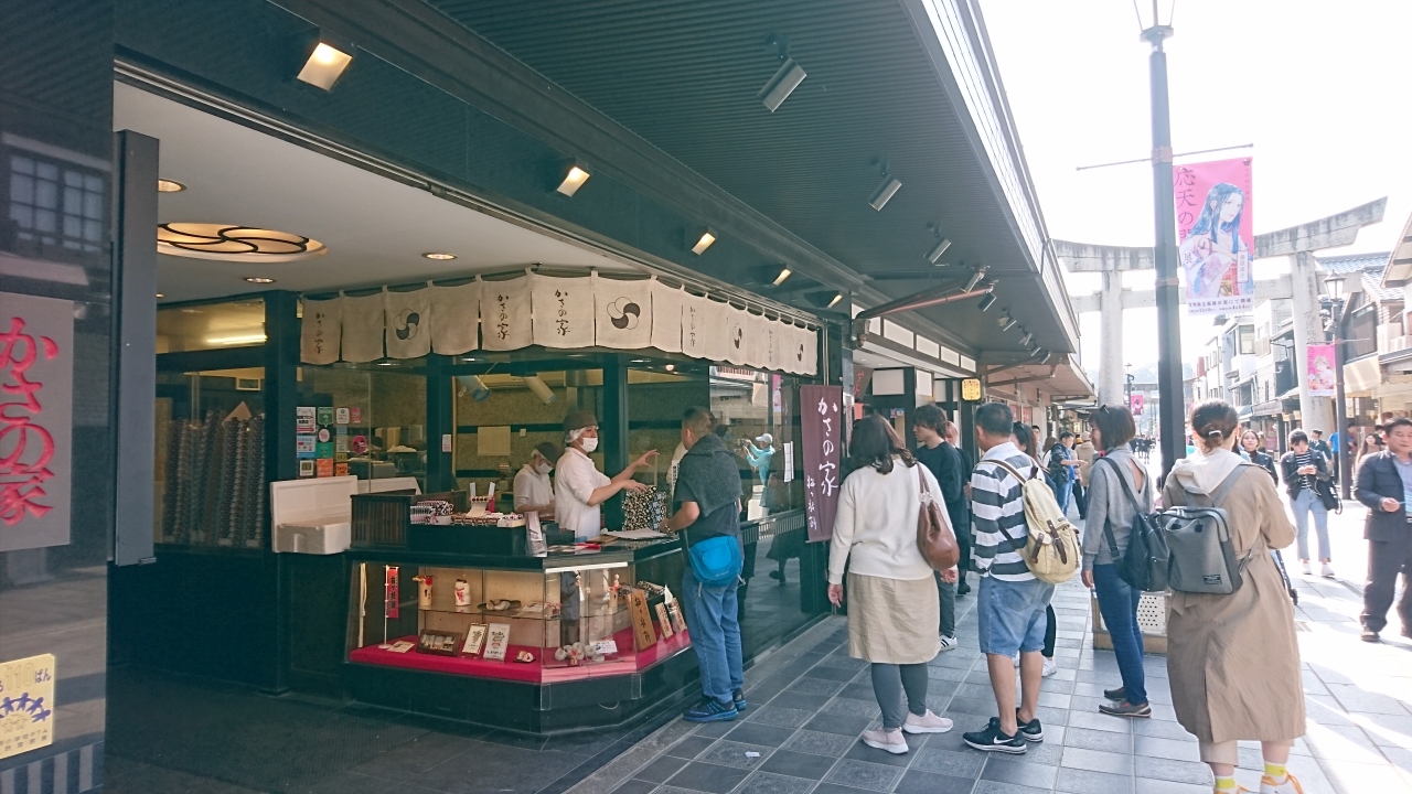 梅が枝餅の名店で、店頭の販売コーナーには熱々の梅が枝餅を求める人が行列を作っています。しかし、奥の喫茶コーナーを利用すると、お土産用として、並ばずに梅が枝餅を購入できます。喫茶コーナーでは、梅づくしのお弁当もありますので、昼食休憩として利用しました。
