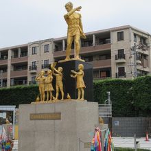 長崎市原爆資料館から地上に上がると、目の前にある歴史民俗資料館の手前に見えたケバケバしい金色の像がこちらです。原爆で亡くなった教師と教え子の像とのことですが、多めで見ると色合いとデザインのせいなのか些か違和感がありました。
