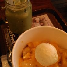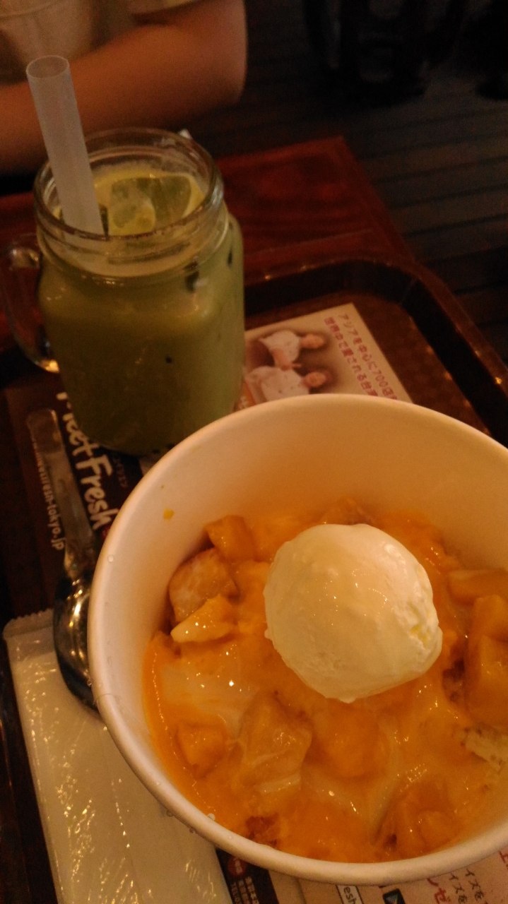 マンゴーミルクかき氷Mサイズ(800円)を注文。氷がジャリジャリしているので食感がいまいちだったけど、マンゴーも結構載っていたので、味としてはまぁ満足。娘が頼んだタピオカ抹茶ミルクティー(650円)を味見したら、タピオカ自体が黒糖の味がするので美味しかった。
