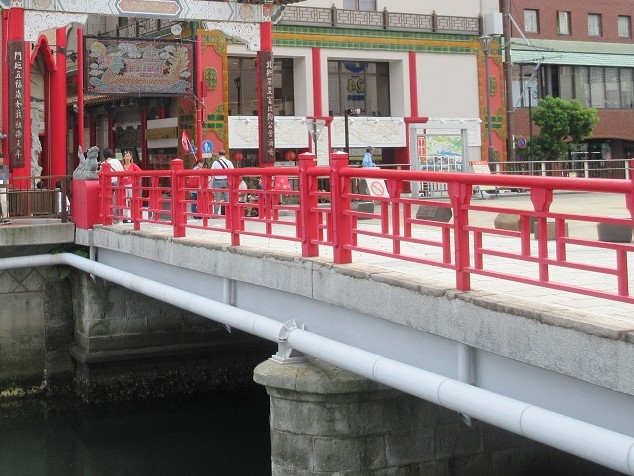 長崎の新地中華街に手前、川に架かる橋が新地橋です。長崎でも浜町という繁華街に近く、大勢の買い物客や観光客がこの橋を行きかっていました。赤く塗られた欄干がとても印象的でした。この橋から川面を見ると、干潮と満ち潮で水位が大きく変わることを見て取ることができ、興味深く感じられました。