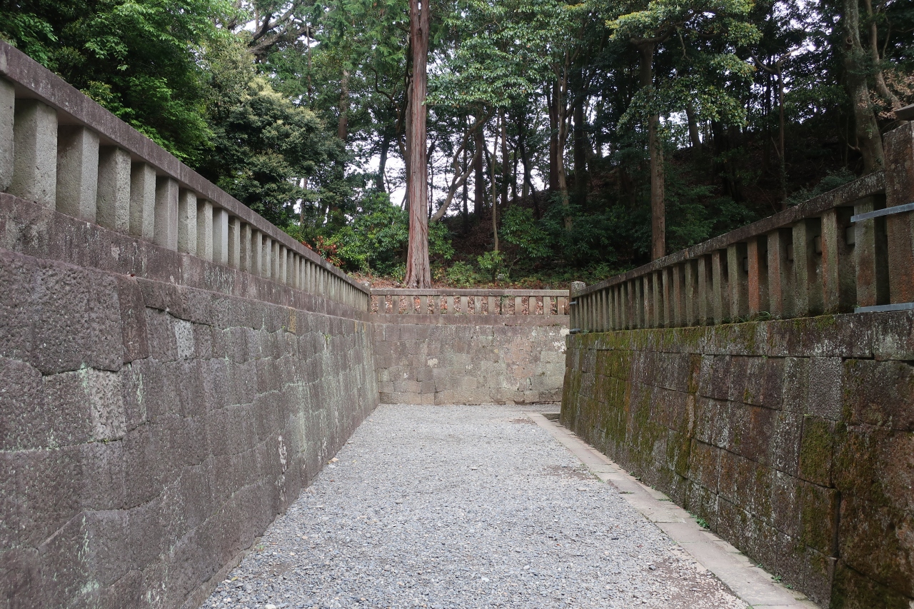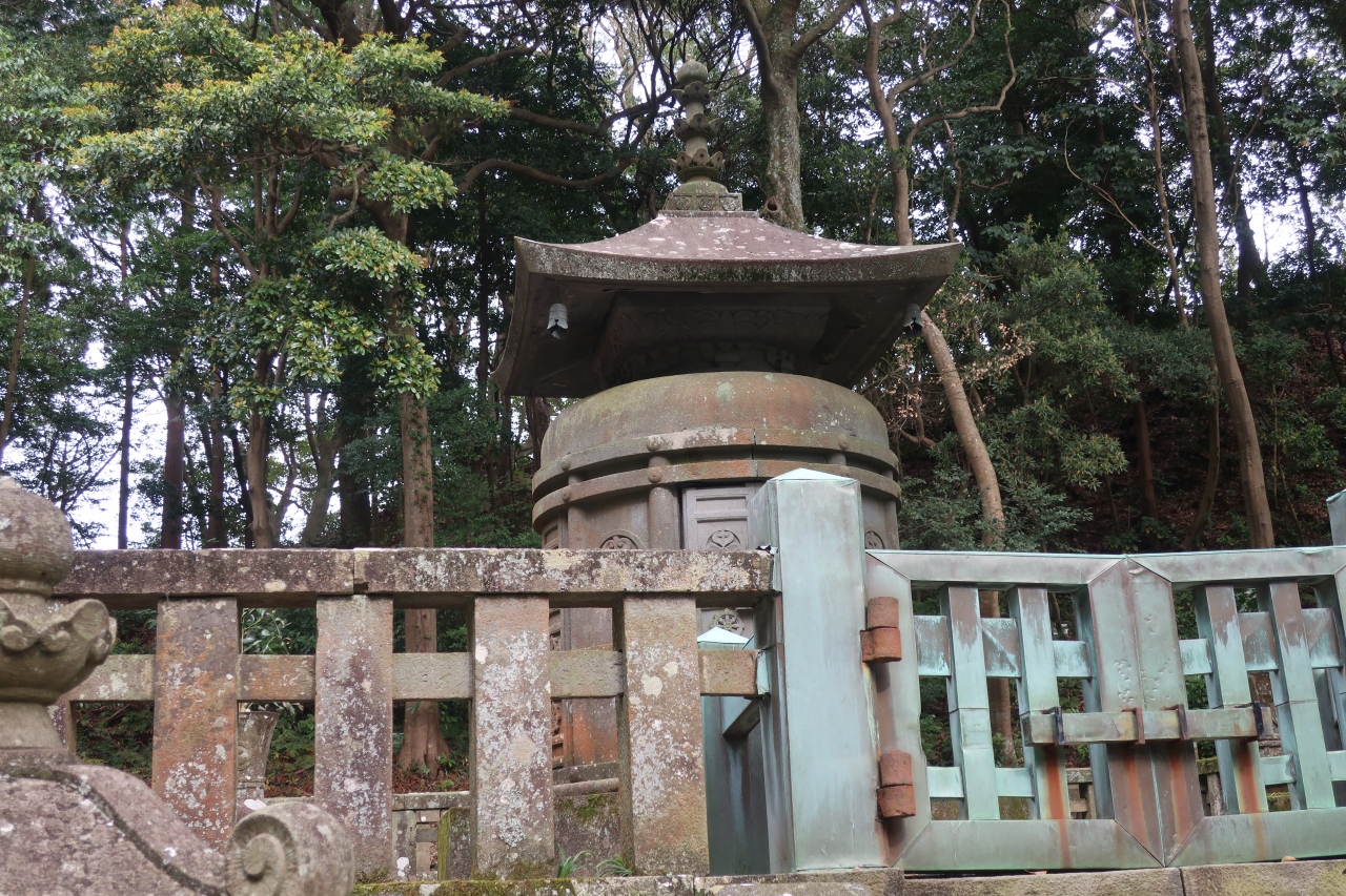 久能山東照宮の社殿の左手から廟所参道を更に進んだ先に久能山の御祭神である徳川家康公の遺骸を埋葬した宝塔があります。ここが神廟です。石垣で囲われた神廟には久能山の他の所とは違い色が無く、とても厳かな雰囲気で、神聖さが漂っています。久能山の中で最もパワーを感じる場所です。