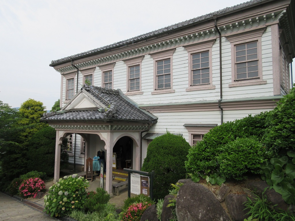 長崎を代表する観光地であるグラバー園の中にある明治16年に建てられた洋館で、元は別の場所にあったものを移築したそうです。裁判所の長官の官舎であったとのことですが、今はレトロ写真館として使われていて、貴婦人のドレスに身を包み、洋館をバックに記念撮影をするお嬢様方に人気のスポットになっていました。