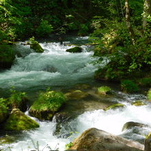 奥入瀬渓流の中流付近、奥入瀬渓流の一番の見応えのあるスポットの付近には大小、様々な岩が点在し、その岩に水の流れがぶつかる事によって、美しい渓流美を作り出しています。島に見えるような岩も、長年かけて出来た「苔」によって、周囲の新緑と相まってとても綺麗でした。