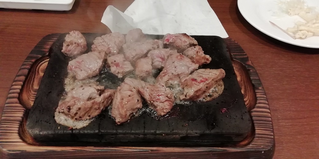お肉については、若干固さがありました。とはいえ、全体ではおいしく食べられました。カットされていないステーキはレアで提供され、溶岩石プレートで焼き加減を調整できます。ソースは塩コショウからオニオンソース、しょうゆなど豊富でした。