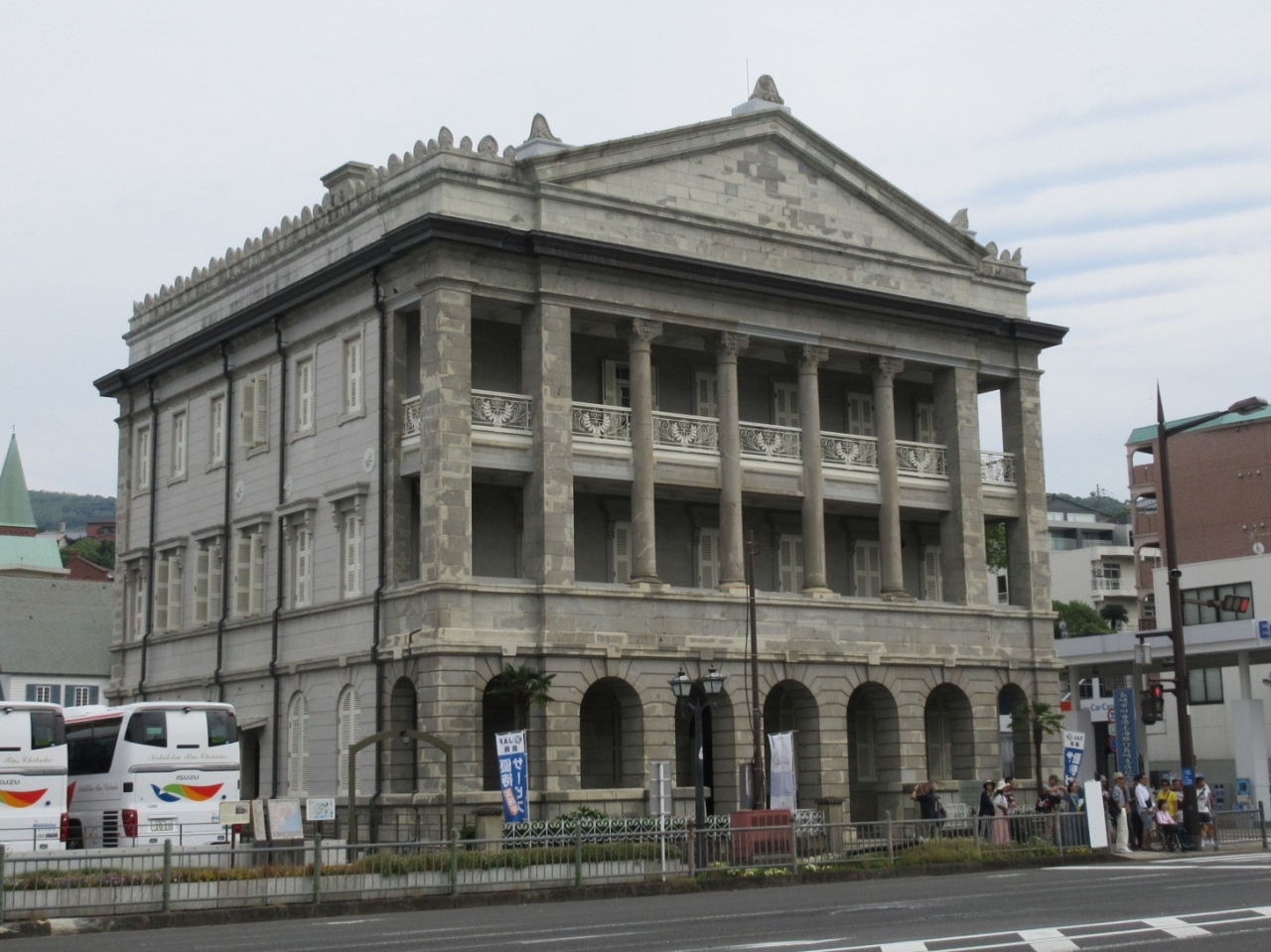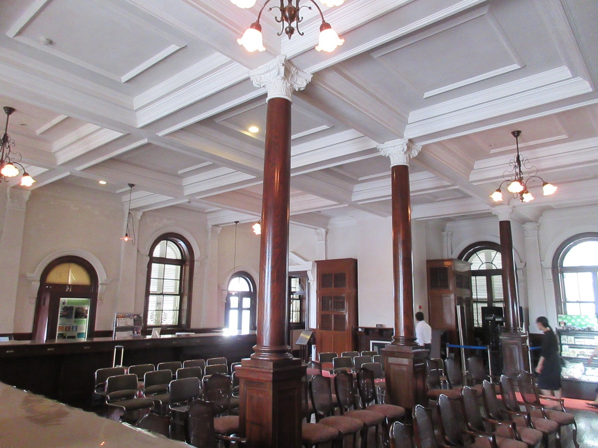 長崎海岸通りに面した、三階建ての重厚感ある建物が香港上海銀行の長崎支店であった建築です。一階は大きな空間木製のカウンターなどがあり、銀行らしい雰囲気を今に伝えています。この銀行が出来た頃の香港はイギリスの植民地、上海にもイギリス租界がありましたから、中国や東アジアを舞台にした英国を中心とする盛んな経済活動が行われていたことに思いを致し、非常に感慨深く感じました。大浦天主堂やグラバー園からも近く、何組からの観光客も訪れていました。