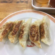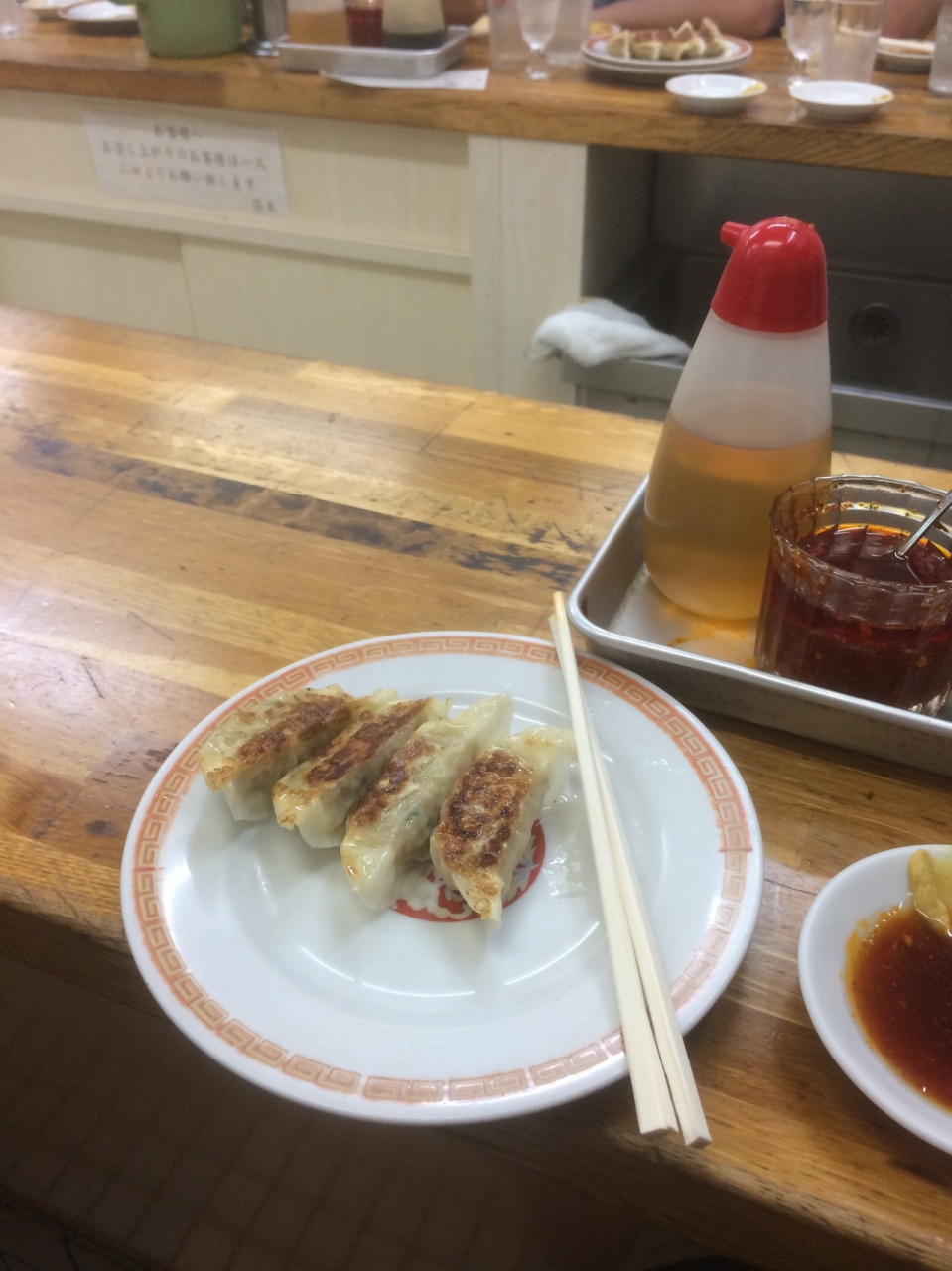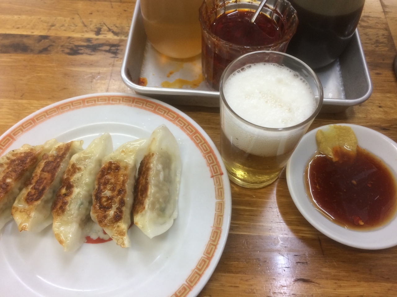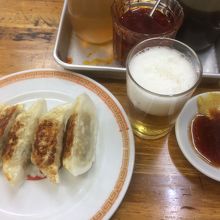 行列店ですがすんなり入店できました。カウンター席に座ると飲み物を聞かれビール小にしました。食べ物は餃子しかなく2皿以上注文しなくてはならないです。一皿5個入りで1分ぐらいで出てきました。特段美味しいとは思いませんでしたがビールがススム味でした。