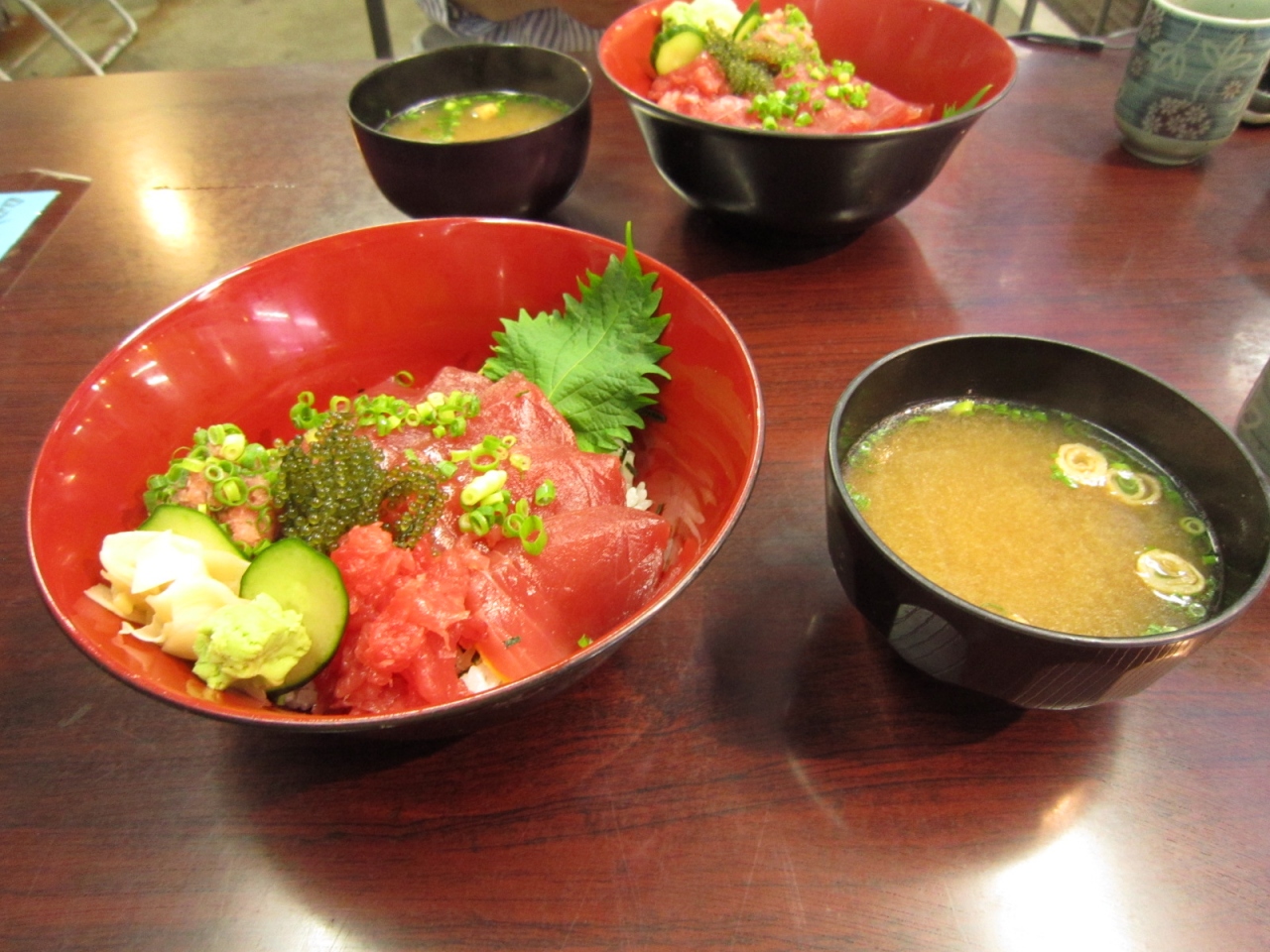 まぐろは、赤身・ネギトロ・中落ちの三種で海ブドウがチョコっとアクセントに乗ってます。