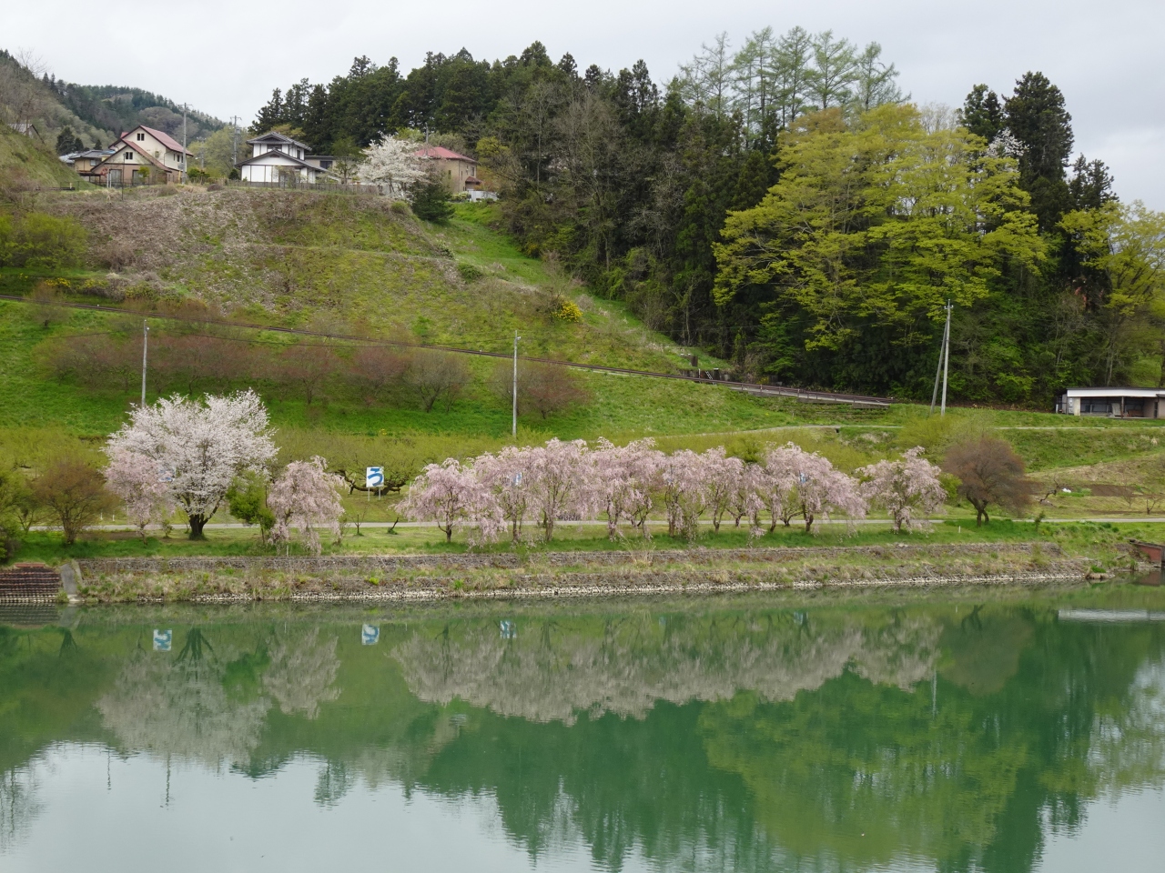 4月の末日に訪れたところ、対岸の桜並木の花が見ごろを迎え、のどかな春景色を楽しむことができました。