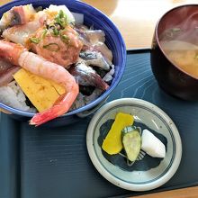 どれも美味しそうですが、迷った時は「おまかせ丼」。1700円で小振りの丼ぶりに、いろいろなお刺身が山盛りでした♪特製のたれがかかっているので、そのまま戴きます。