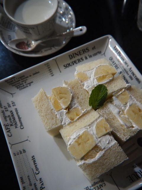 食パンの間に、たっぷりの生クリームと、バナナと、パイナップルを挟んでいる。薄い黄色でまとまったフルーツサンド。