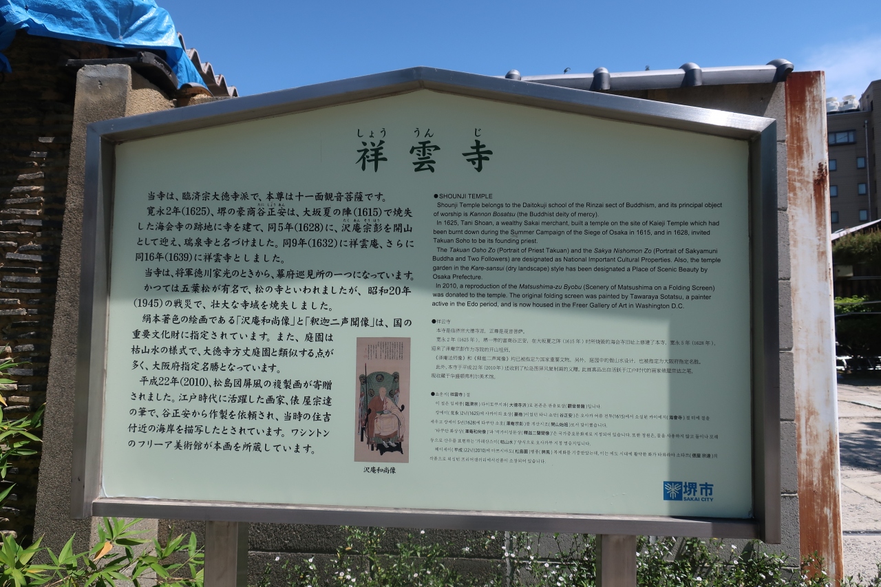 17世紀に創建された、臨済宗大徳寺派のお寺です。大坂夏の陣で焼失した海会寺の跡地に堺の豪商によってお寺が建てられ、瑞泉寺と名づけられた後も、祥雲庵と改名され、1639年に現在の名前である祥雲寺となったそうです。
