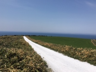 360度見渡せる景色。たくさんの風力発電の羽が狭苦しくなく悠々と並んでる。こんなところが日本にもあったんだなぁと思いました。それとフットパスの白い道といわれてる名前そのままの道。南国みたいな景色だけど日本の一番北の景色。