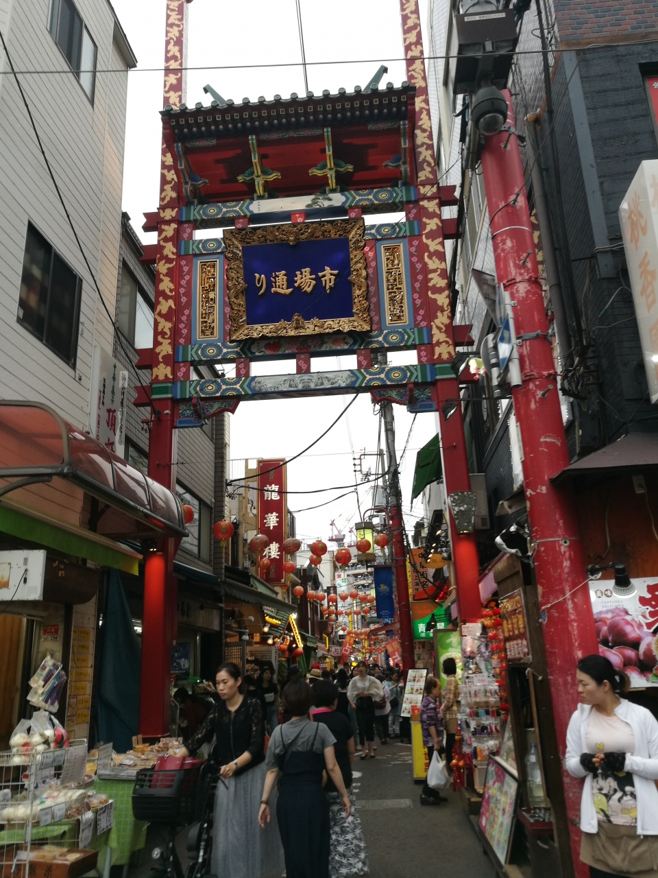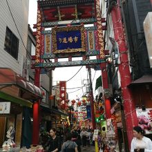 戦後は朝市通りと呼ばれて大変な賑わいをみせ昭和40年代の終わりころまで、そんなお店がこの通りには軒を連ねていたそうですが、今はすっかり周辺と同じ中華料理店になっています。通りの入口と出口に市場通りの看板の掛かる門があります。
