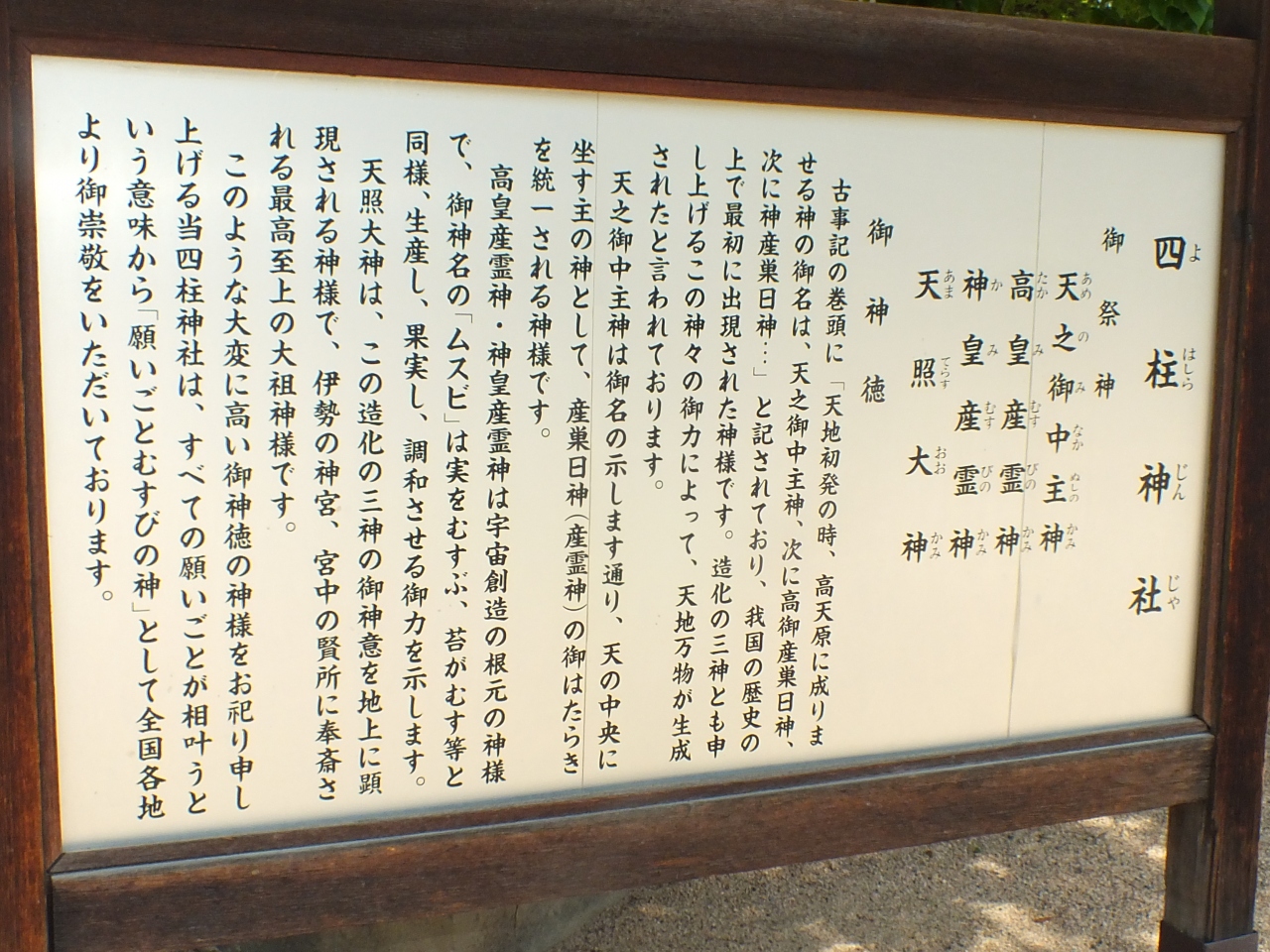 天之御中主神、高皇産霊神、神皇産霊神、天照大神の四神が祭られている神社です。