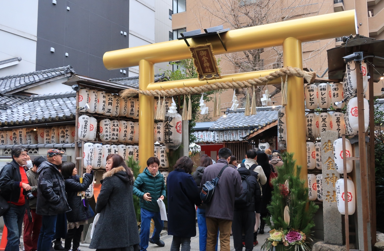 観光客気分だと参拝する気が半減するほどの行列だ。鉄や金属の神様が祭られており、かつては金型に関する崇拝を集めていた。その後、「金」から派生して「お金」にまつわる願掛けが増える。絵馬を見ると資産運用や証券取引の成功、競馬競輪での勝利、宝くじの当せんなどを願うものが多い。黄金の鳥居、金色の鈴緒とにぎやかだ。太陽神の天照大神に夜の神様である月読神も併せて祭られているため、昼だけでなく夜の参拝も可能。日没後の参拝も多い。