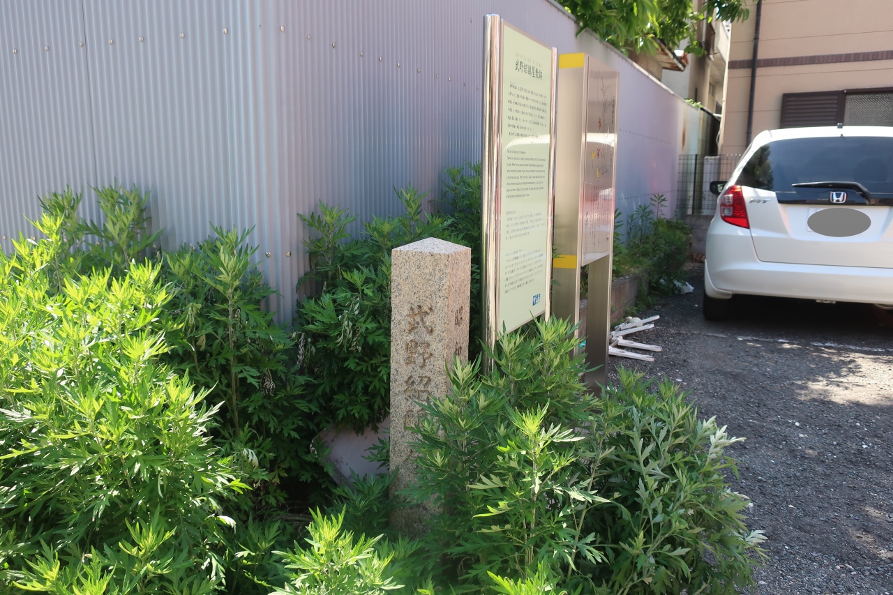 千利休の茶の湯の師匠である竹野紹鴎の屋敷跡の碑は駐車場の一角にひっそりとありました。ここだけを目当てに来るということはないかもしれませんが、堺市博物館の前には銅像があり、ゆかりのある南宗寺も付近にあるので、あわせて訪問することで理解が深まりそうです。