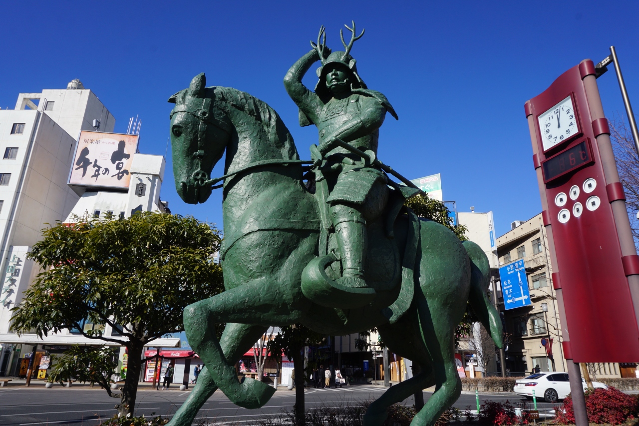 真田幸村公騎馬像は、上田駅の駅前ロータリーの中。緑色の銅像でちょっと変わった感じ。例の鹿の角の兜をかぶっていますが、幸村の風貌も少しというかだいぶ若いような。老練な武将というイメージからするとちょっと違和感があるような気がしました。