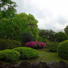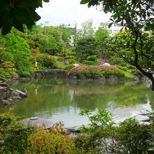 落ち着いた庭園ですが、高層ビルや高いクレーンが見える大都会の中の庭です。