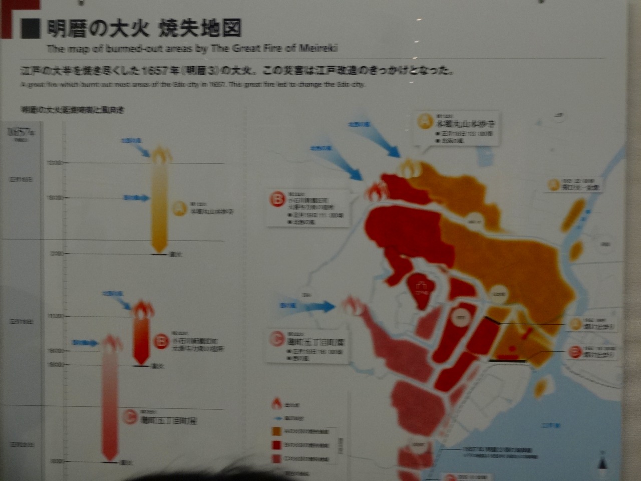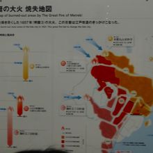 さて展示のひとつには江戸時代でも悲惨な災害だった明暦の大火の延焼状況を示した図があります。