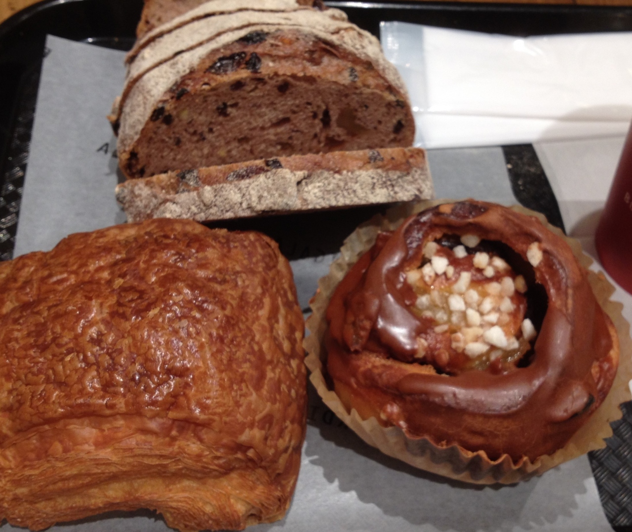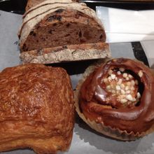 初めての利用だったので、試しに少しいただいてみようと思ったのですが、どれも美味しそうに見えたので、予定外に3つも選んでしまいました。セーグルフリュイ(280円)、パンオショコラ(230円)、アップルシナモンロール(240円)を店内でいただきました。価格はお手頃でしたが、お味は特に印象に残らない感じで、ごく普通のパン屋さんかなと思いました。