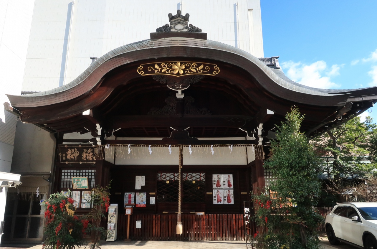 四条通に面した藤井大丸の東側の寺町通りを南に下ると左側にこの神社がある。明治維新後に伊勢神宮に参拝できない善男善女のために設けられた遥拝所が起源だという。その後、伊勢神宮の内宮外宮から勧請し、神社へと発展した。本殿の建物は一条家の玄関と書院を移築したもので、大きな唐破風が特徴だ。また、手水舎の水盤は伏見城から移設されたものだ。気になるのは授与品に描かれた「巫女」のキャラクター。良くも悪くも、作風が「萌え」なのだ。