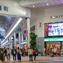 高知市内にはアーケードのある商店街が多く、天候に左右されずに利用できるのがいいです。こちらは、帯屋町一丁目商店街からひろめ市場までの商店街で、それほど距離はありませんでしたが、人通りは多く賑わっていました。大きな本屋さんが目立っていました。