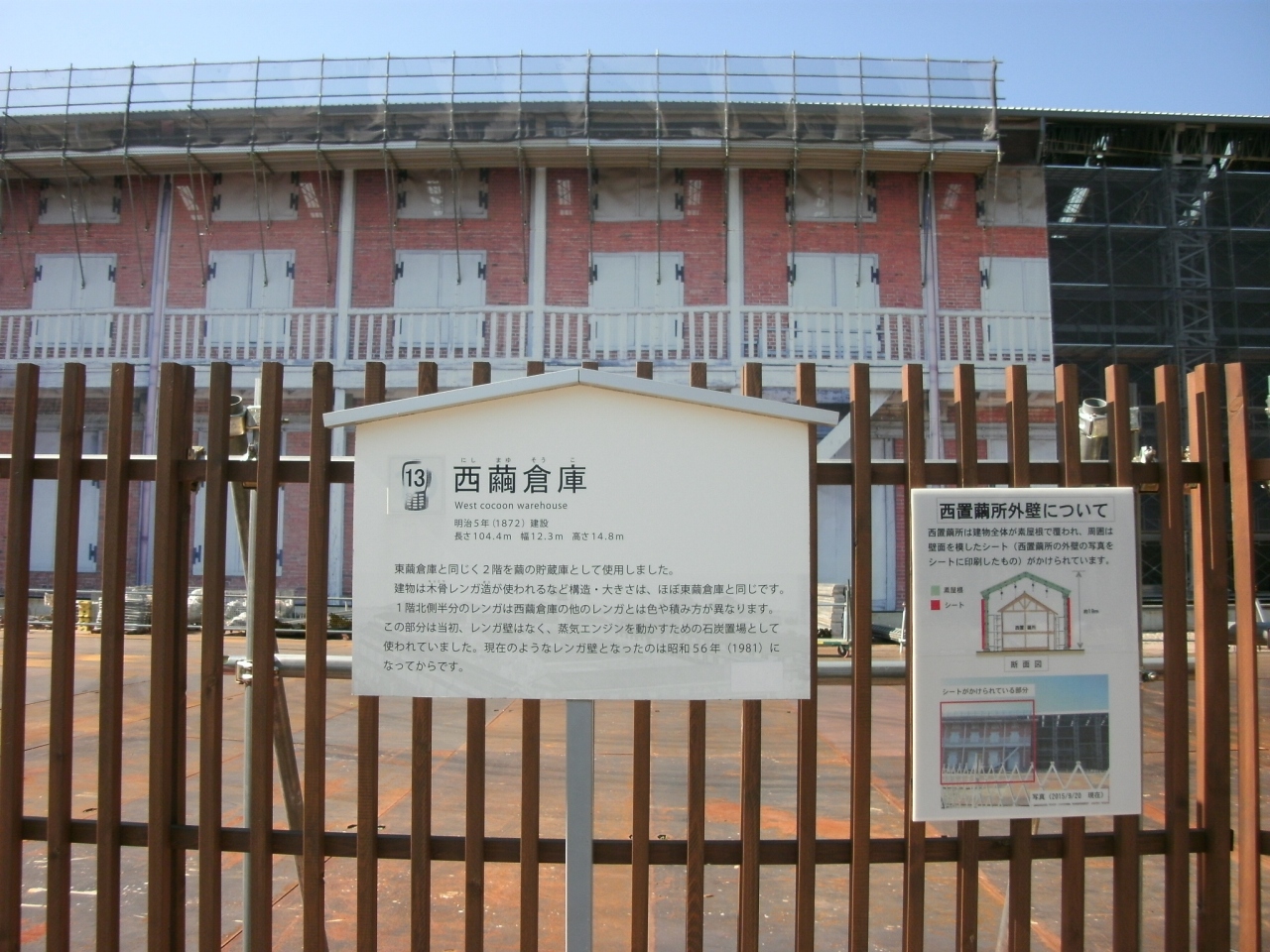 富岡製糸場には東と西に置繭所が1つずつ有ります。こちらは西にあるた西置繭所と呼ばれています。木の骨組みに煉瓦を積み重ねる「木骨煉瓦造」という珍しい工法がとられていて、構造・大きさは東繭倉庫とほぼ同じ造りをしています。訪れたときは、保全に向けた修復工事中で、富岡製糸場の入場料とは別に200円を払ってヘルメットを借りて工事中の現場を見学できましたが、残念ながら内部写真の撮影は禁止されていました。