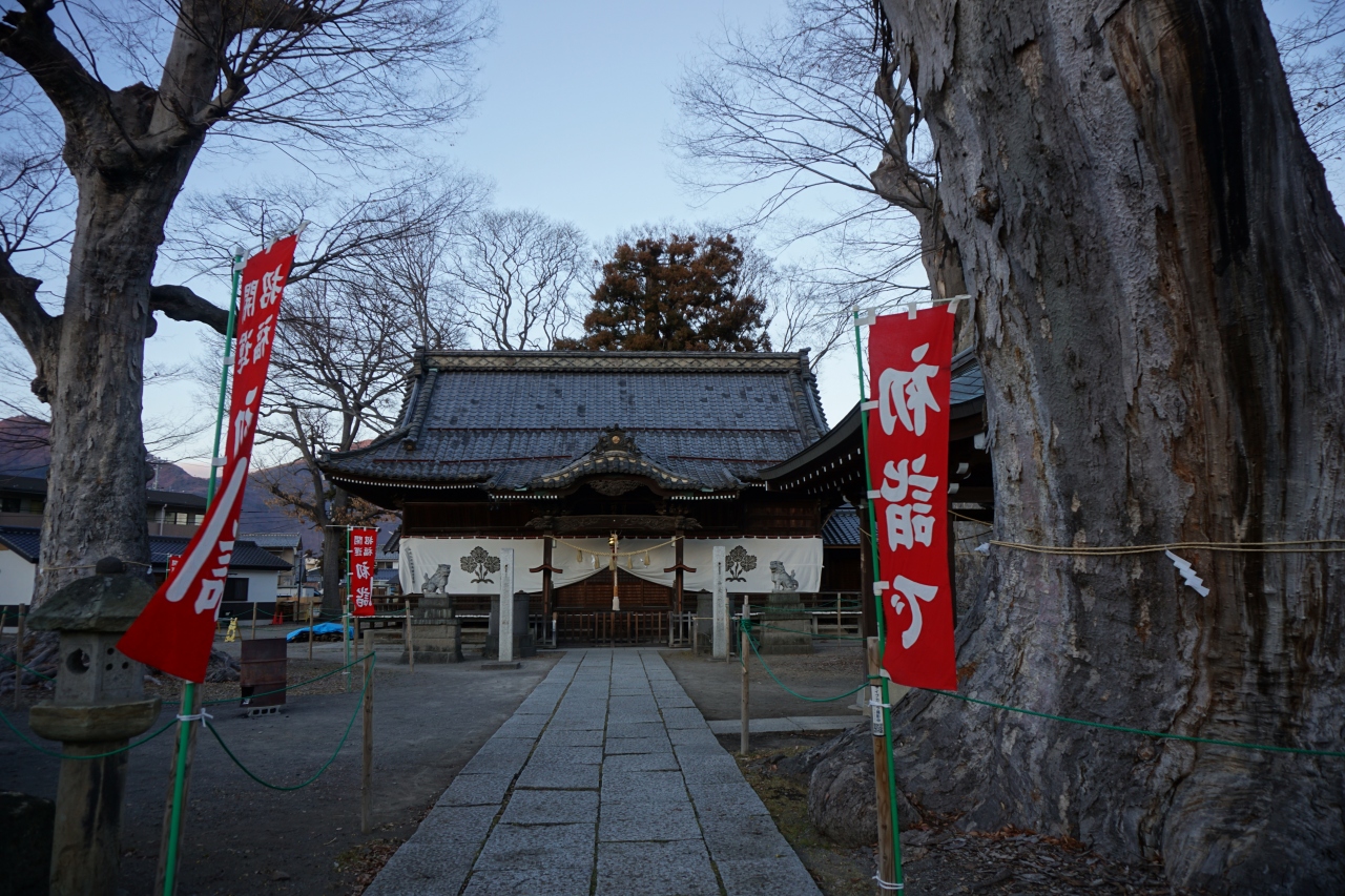 科野大宮社は、大己貴命 (おおなむちのみこと)、事代主命 (ことしろぬしのみこと)を祀り、信濃国総社とも推定される由緒ある神社。