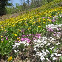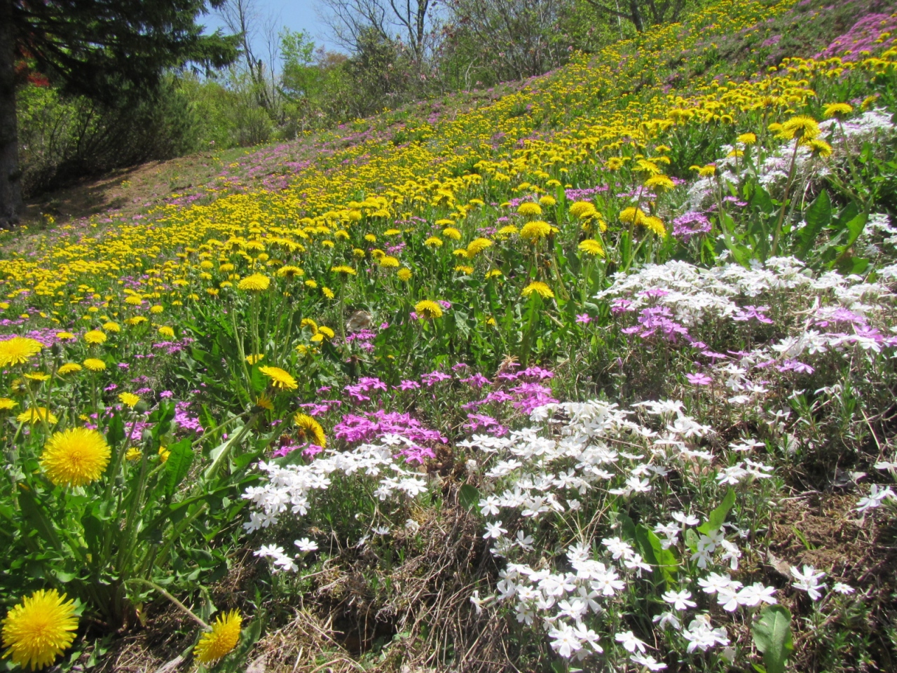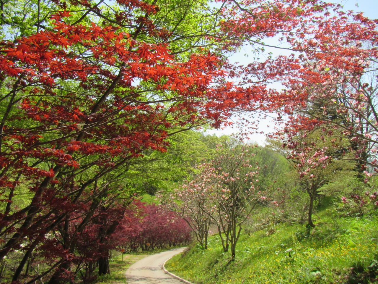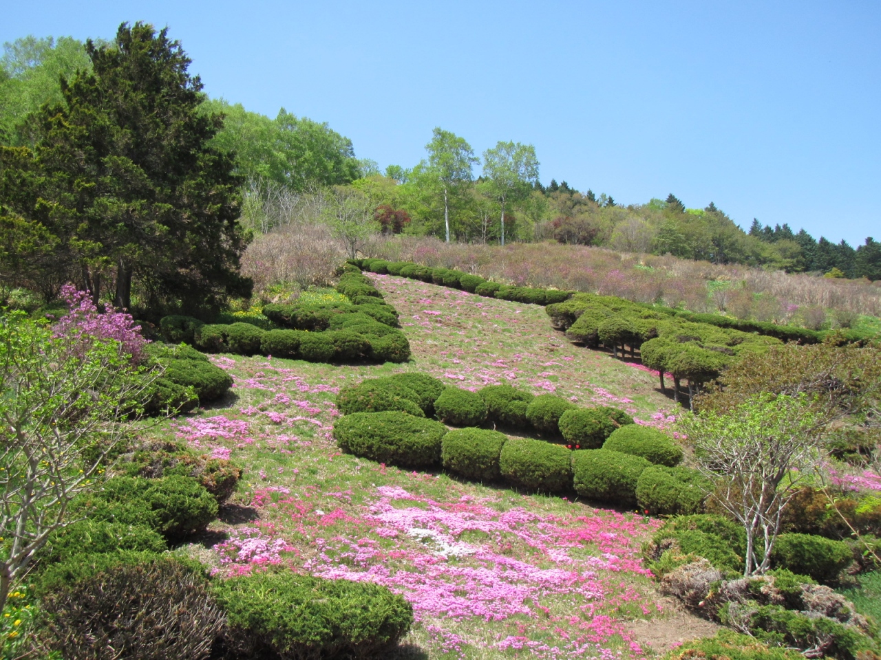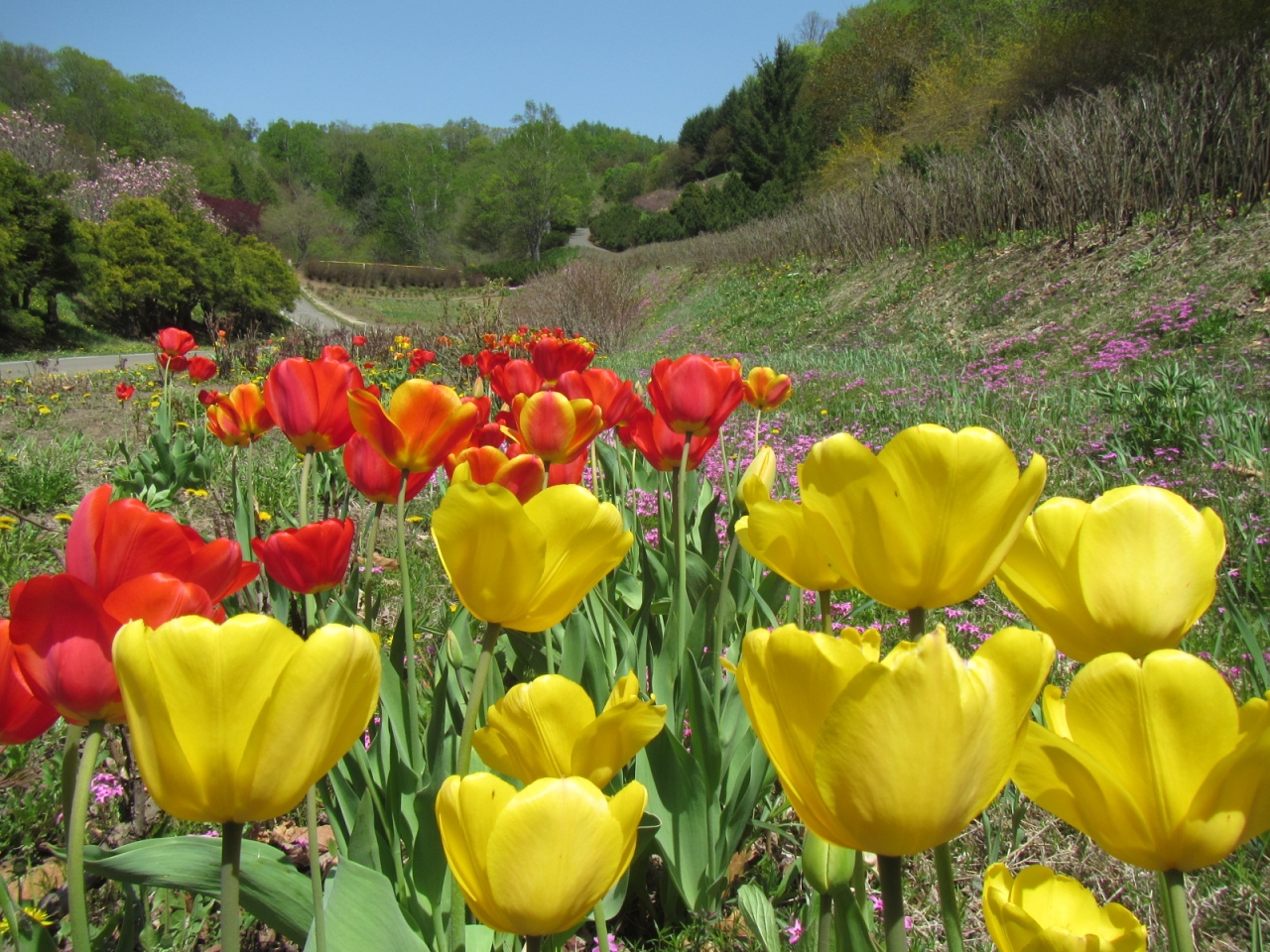5月中旬に訪れました。桜(5月初旬見頃)は既に終わり、チューリップや一部に芝桜が咲いていましたが、北見フラワーパラダイスのホームページに載っている花地図ほど、見られる花のボリュームは無く、昔に賑わった花の見どころという印象でした。花が豪華な園芸植物が見られるのは入口のところくらいで、後はタンポポやニリンソウなどの野花に頼っている感じです。時期も桜が終わった後なので、そういう印象になってしまったのかもしれませんが、花を見るというよりも、新緑の散策が楽しめる丘でした。