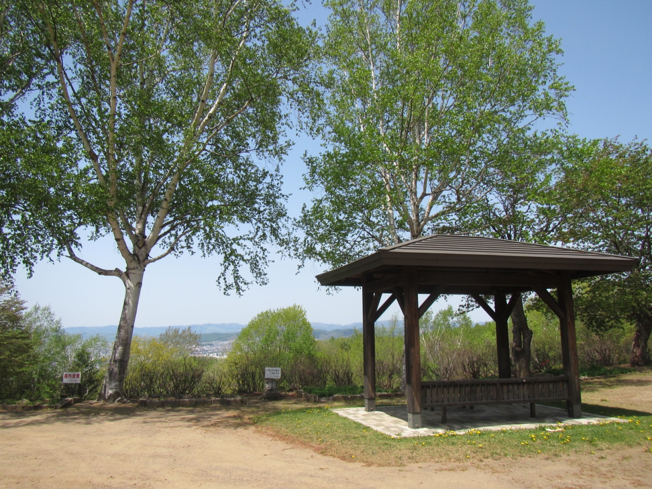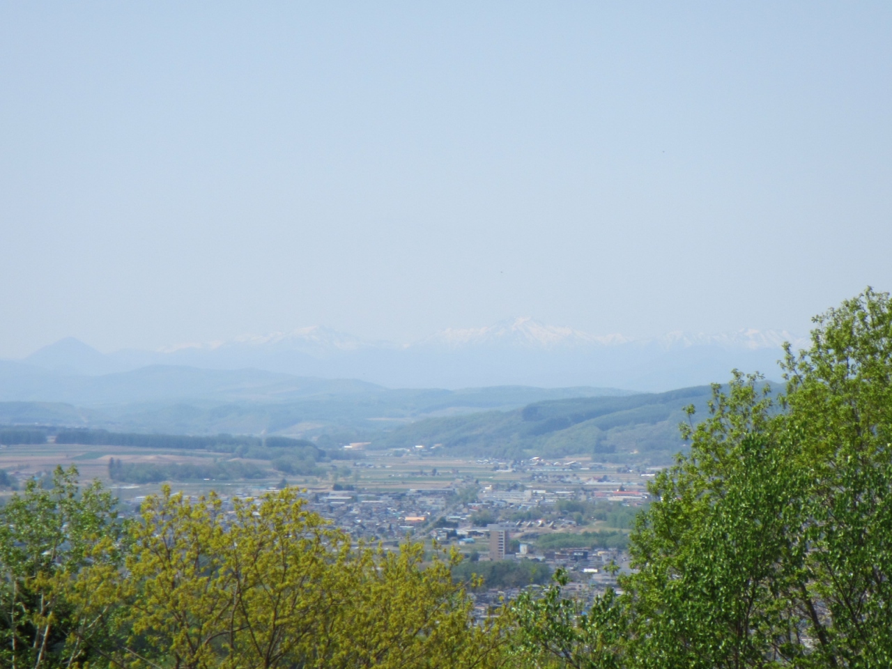 頂上では視界に木が伸びてきているものの、北見の街が遠望できます。簡易なあずま屋や多少のベンチがあって、休憩できました。視界が良い日だったので、遠くに大雪の山並みも少し見えました。