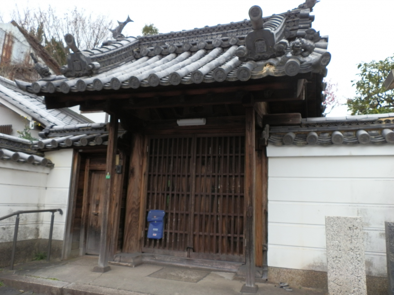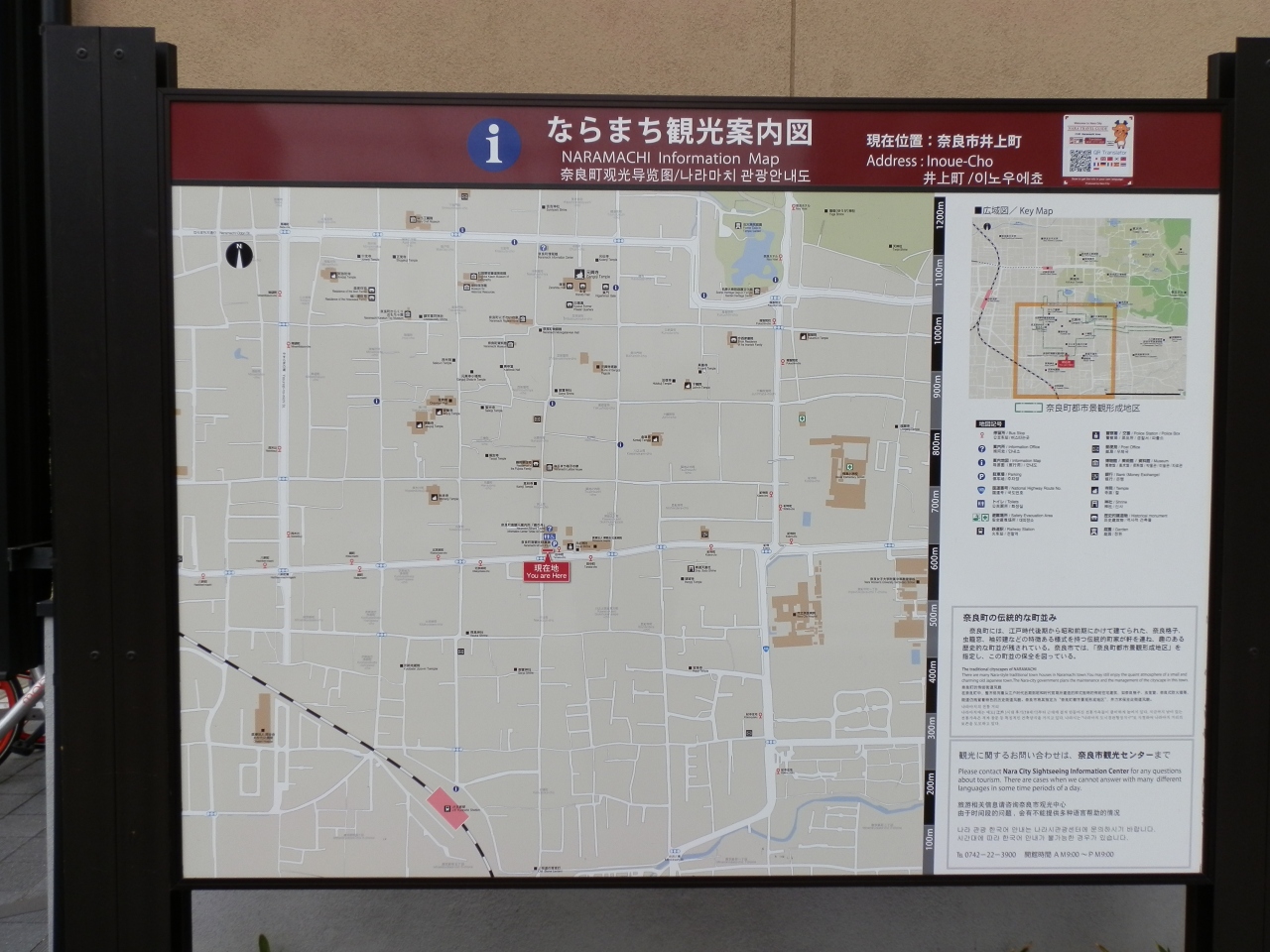 ならまちの玄関口「田中町バス停」でバスを下車しました。「田中町バス停」近くに「奈良町南観光案内所」、「奈良町南観光駐車場」、「トイレ」などがあります。そこに「ならまち観光案内図」が立っています。蛍光ペンで印を付けた見所を目指し歩きました。途中に重厚感の瓦が重そうな木造の古い門があり、気になりました。