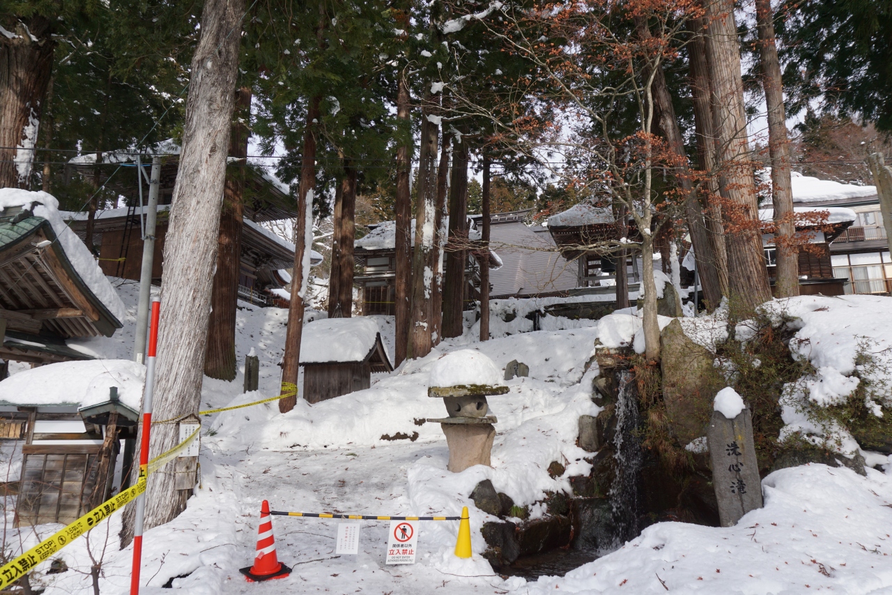 創建は永禄11年(1568年)。聖徳太子が自ら彫り込んだと伝えられている薬師如来を安置したことが始まり。また、野沢菜発祥の地として知られるのも面白いところ。冬だったので雪に埋もれていましたが、山の斜面に参道がまっすぐ。山寺風の風情ある眺めとなっています。