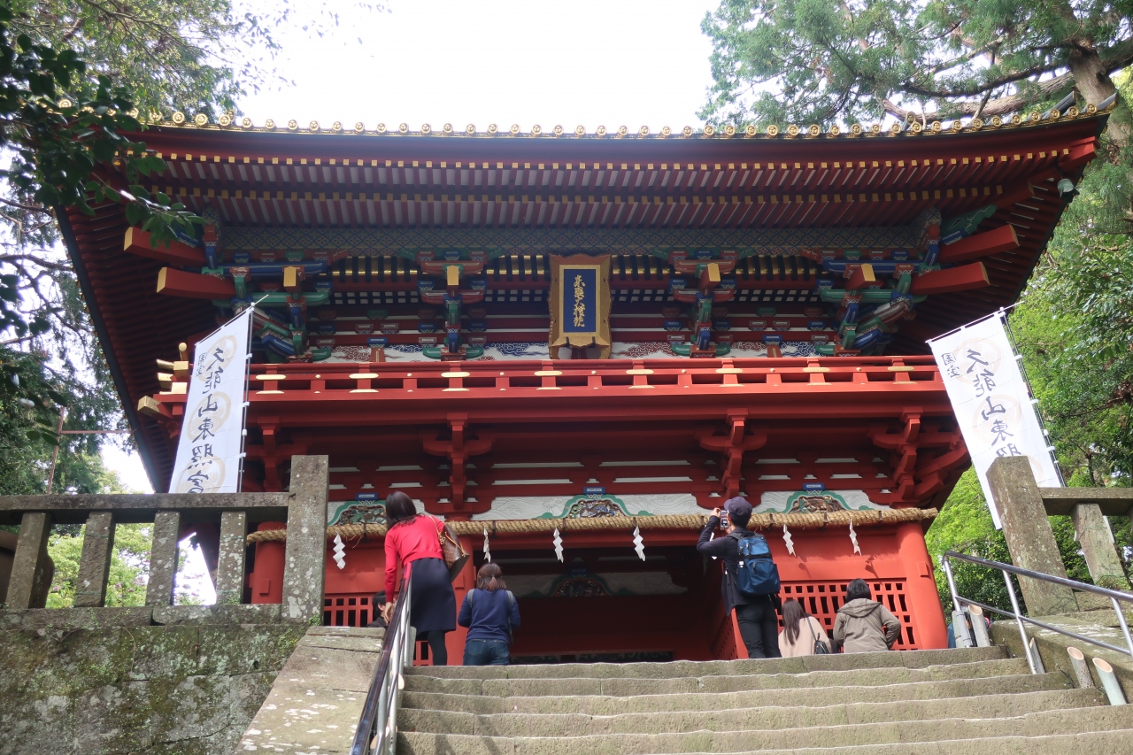 日本平ロープウェイを降り、久能山東照宮に入山して最初に出迎えてくれる建物が久能山東照宮 楼門です。1617年に建てられた楼門は銅瓦葺、入母屋造りの楼門形式で重要文化財に指定されています。石段を上った所に極彩色の装飾が施された楼門があり、下から見上げると圧倒されるほどの存在感があります。