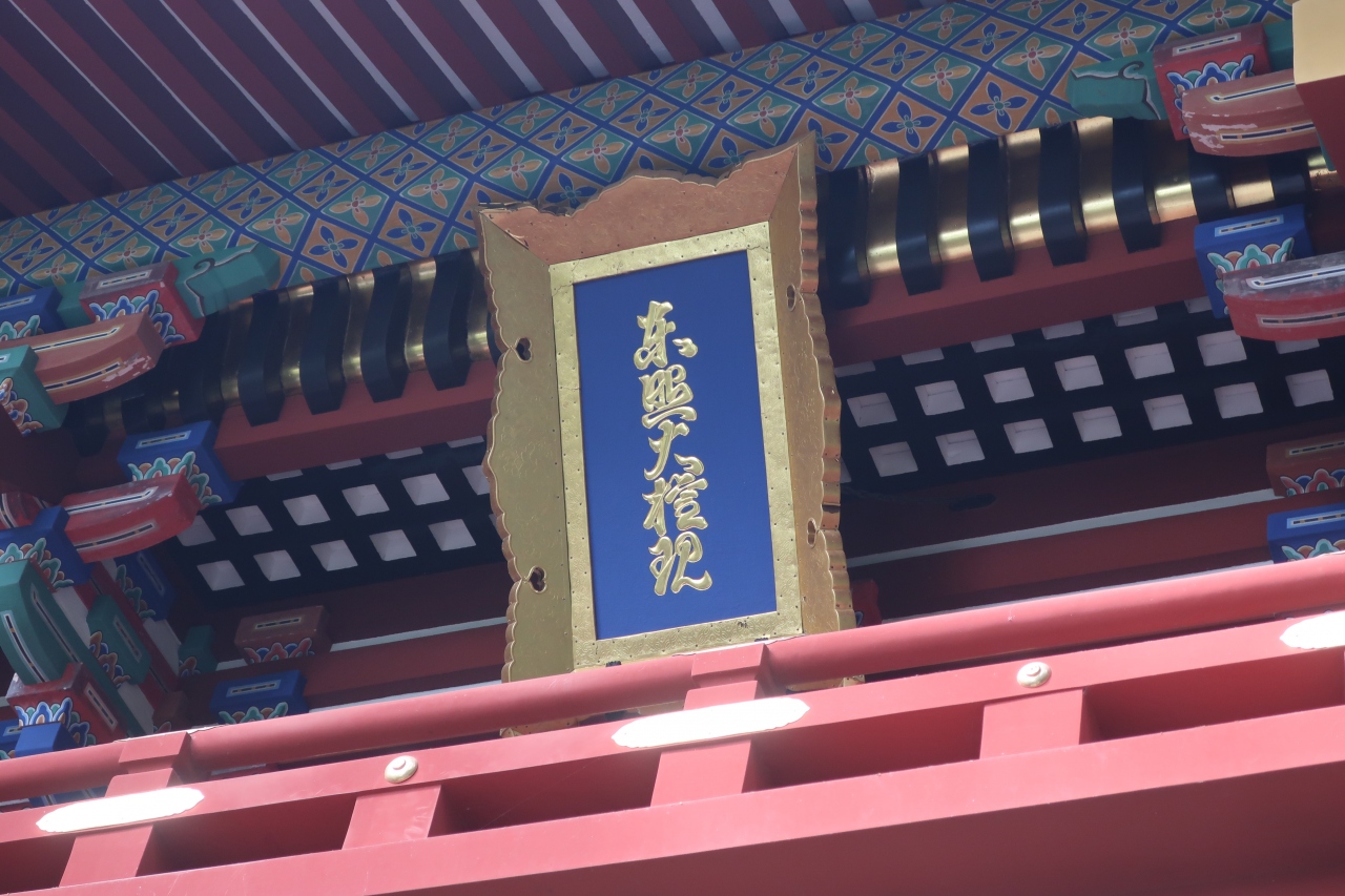 上層に掲げられた青地に金色の文字で書かれた「東照大権現」の額は後水尾天皇の御宸筆で、天皇じきじきの文字が見られるのも凄い。