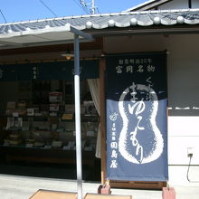 富岡製糸工場の正面入口の前にあります。富岡製糸場を見学後した後、富岡名物「くず湯まゆこもり」という看板が気になって立ち寄りました。小さな和菓子店で、どら焼きや最中、羊羹、饅頭などかショーケースに並んでいます。名物だという「くず湯まゆこもり 抹茶700円/10個入り」を自家用のお土産に購入しました。お味には、抹茶の他にプレーンや生姜、シルクなどもありました。