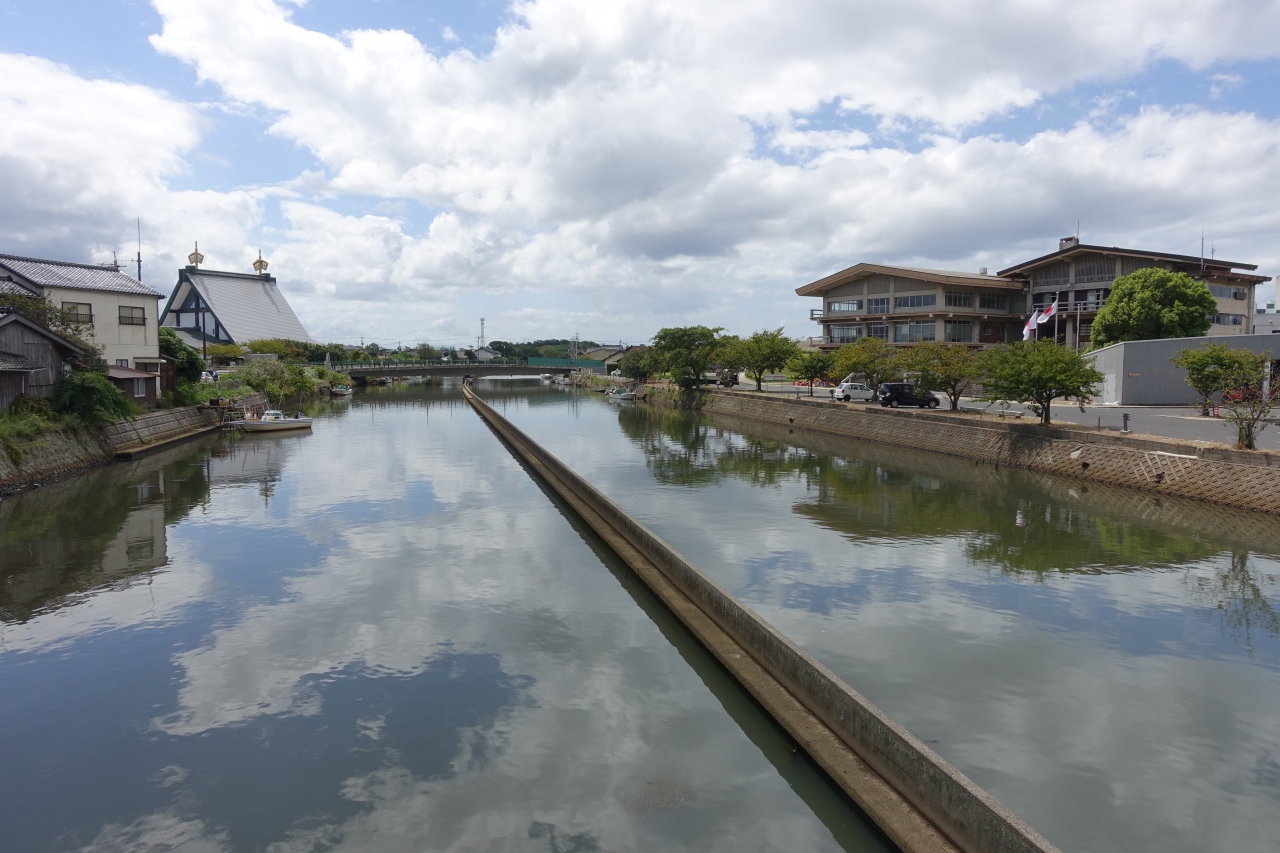 橋を渡り大鳥居をくぐると、いよいよ参道に入ったなという感じがします。橋の上から堀川を眺めると、川の真ん中に仕切りがあって2つの川のようになっていたのが不思議でした。