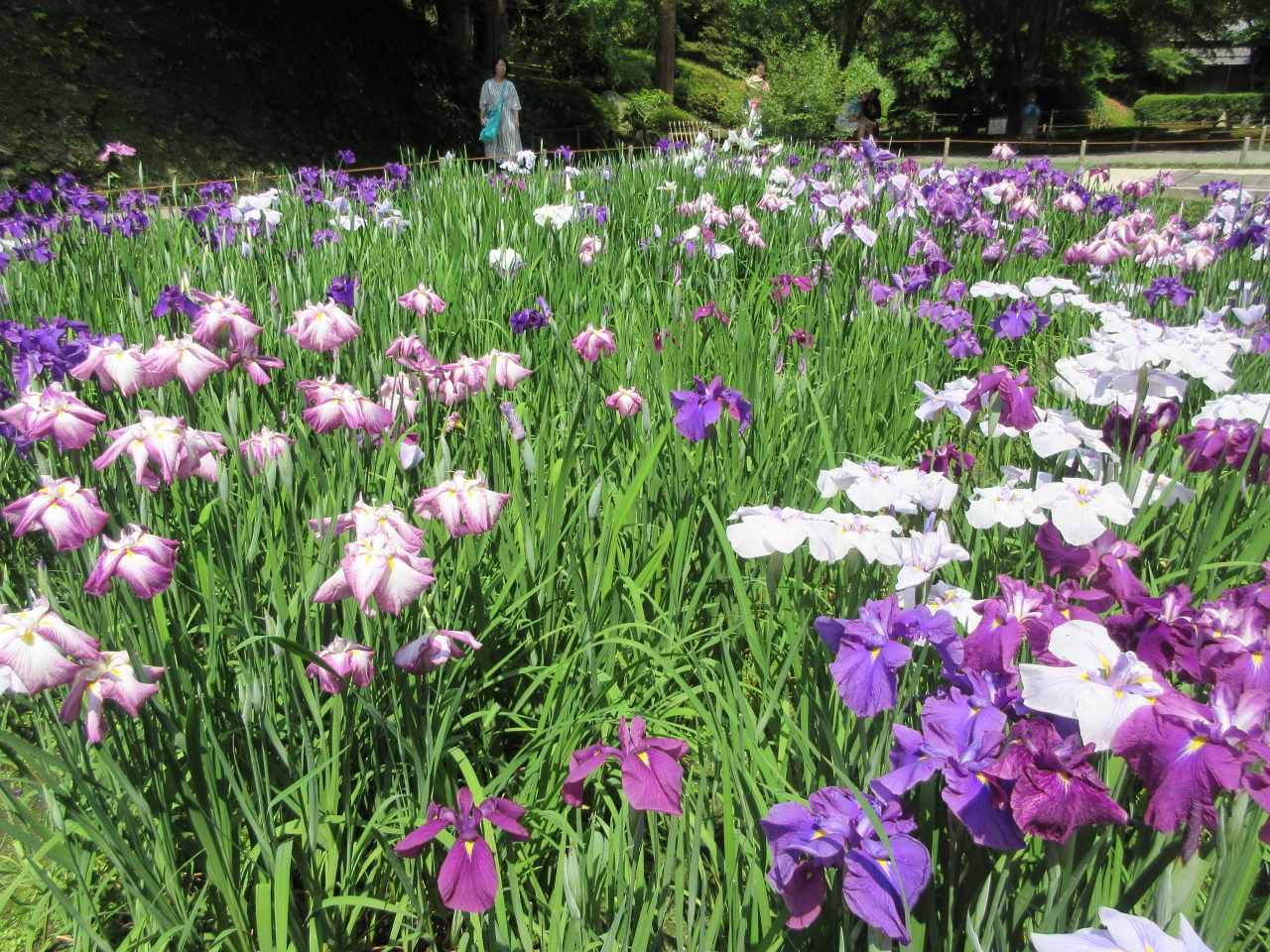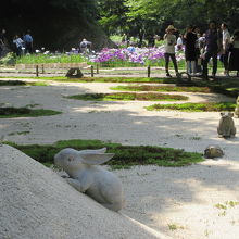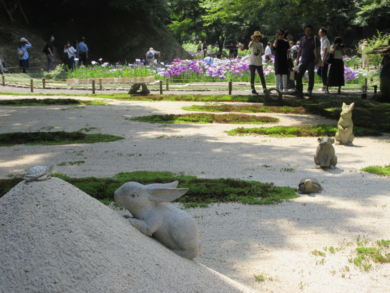 紫陽花で知られる明月院の本堂裏に造られた庭園です。明月院入園料以外に特別料金を払わなくてはならない庭園なので、多くの人で賑わう紫陽花が咲くエリアと異なり、静かな中で庭園を鑑賞することができます。6月の園内は大きな花をつけた花菖蒲や、岩に生えた可憐なイワタバコを楽しむことができます。庭園入口に造られた石庭では可愛らしいウサギや亀の置物、赤地蔵や青地蔵が観光客を出迎えてくれます。紫陽花が全盛になる前に明月院を訪れた際には、おすすめできる庭園です。本堂の丸窓を裏から眺めることもできます。